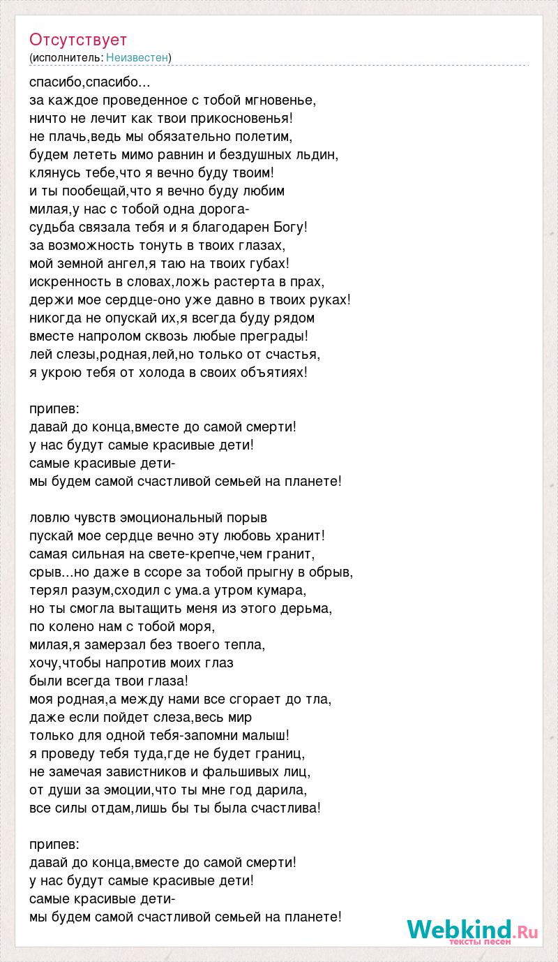 спасибо,спасибо... за каждое проведенное с тобой мгновенье, ничто не лечит как твои прикосновенья! не плачь,ведь мы обязательно полетим, будем лететь мимо равнин и бездушных льдин, клянусь тебе,что я вечно буду твоим! и ты пообещай,что я вечно буду любим милая,у нас с тобой одна дорога- судьба связала тебя и я благодарен Богу! за возможность тонуть в твоих глазах, мой земной ангел,я таю на твоих губах! искренность в словах,ложь растерта в прах, держи мое сердце-оно уже давно в твоих руках! никогда не опускай их,я всегда буду рядом вместе напролом сквозь любые преграды! лей слезы,родная,лей,но только от счастья, я укрою тебя от холода в своих объятиях! припев: давай до конца,вместе до самой смерти! у нас будут самые красивые дети! самые красивые дети- мы будем самой счастливой семьей на планете! ловлю чувств эмоциональный порыв пускай мое сердце вечно эту любовь хранит! самая сильная на свете-крепче,чем гранит, срыв...но даже в ссоре за тобой прыгну в обрыв, терял разум,сходил с ума.а утром кумара, но ты смогла вытащить меня из этого дерьма, по колено нам с тобой моря, милая,я замерзал без твоего тепла, хочу,чтобы напротив моих глаз были всегда твои глаза! моя родная,а между нами все сгорает до тла, даже если пойдет слеза,весь мир только для одной тебя-запомни малыш! я проведу тебя туда,где не будет границ, не замечая завистников и фальшивых лиц, от души за эмоции,что ты мне год дарила, все силы отдам,лишь бы ты была счастлива! припев: давай до конца,вместе до самой смерти! у нас будут самые красивые дети! самые красивые дети- мы будем самой счастливой семьей на планете!