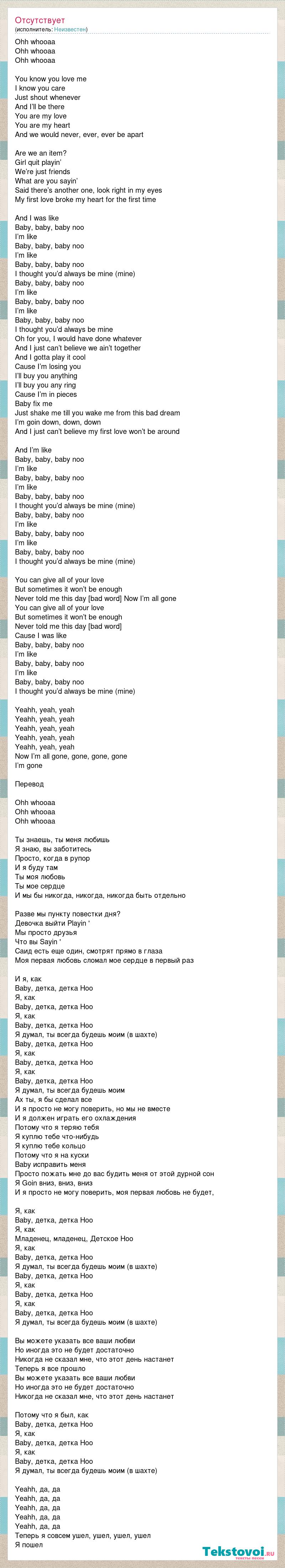 Ohh whooaa Ohh whooaa Ohh whooaa You know you love me I know you care Just shout whenever And I’ll be there You are my love You are my heart And we would never, ever, ever be apart Are we an item? Girl quit playin’ We’re just friends What are you sayin’ Said there’s another one, look right in my eyes My first love broke my heart for the first time And I was like Baby, baby, baby noo I’m like Baby, baby, baby noo I’m like Baby, baby, baby noo I thought you’d always be mine (mine) Baby, baby, baby noo I’m like Baby, baby, baby noo I’m like Baby, baby, baby noo I thought you’d always be mine Oh for you, I would have done whatever And I just can’t believe we ain’t together And I gotta play it cool Cause I’m losing you I’ll buy you anything I’ll buy you any ring Cause I’m in pieces Baby fix me Just shake me till you wake me from this bad dream I’m goin down, down, down And I just can’t believe my first love won’t be around And I’m like Baby, baby, baby noo I’m like Baby, baby, baby noo I’m like Baby, baby, baby noo I thought you’d always be mine (mine) Baby, baby, baby noo I’m like Baby, baby, baby noo I’m like Baby, baby, baby noo I thought you’d always be mine (mine) You can give all of your love But sometimes it won’t be enough Never told me this day [bad word] Now I’m all gone You can give all of your love But sometimes it won’t be enough Never told me this day [bad word] Cause I was like Baby, baby, baby noo I’m like Baby, baby, baby noo I’m like Baby, baby, baby noo I thought you’d always be mine (mine) Yeahh, yeah, yeah Yeahh, yeah, yeah Yeahh, yeah, yeah Yeahh, yeah, yeah Yeahh, yeah, yeah Now I’m all gone, gone, gone, gone I’m gone Перевод Ohh whooaa Ohh whooaa Ohh whooaa Ты знаешь, ты меня любишь Я знаю, вы заботитесь Просто, когда в рупор И я буду там Ты моя любовь Ты мое сердце И мы бы никогда, никогда, никогда быть отдельно Разве мы пункту повестки дня? Девочка выйти Playin ' Мы просто друзья Что вы Sayin ' Саид есть еще один, смотрят прямо в глаза Моя первая любовь сломал мое сердце в первый раз И я, как Baby, детка, детка Ноо Я, как Baby, детка, детка Ноо Я, как Baby, детка, детка Ноо Я думал, ты всегда будешь моим (в шахте) Baby, детка, детка Ноо Я, как Baby, детка, детка Ноо Я, как Baby, детка, детка Ноо Я думал, ты всегда будешь моим Ах ты, я бы сделал все И я просто не могу поверить, но мы не вместе И я должен играть его охлаждения Потому что я теряю тебя Я куплю тебе что-нибудь Я куплю тебе кольцо Потому что я на куски Baby исправить меня Просто пожать мне до вас будить меня от этой дурной сон Я Goin вниз, вниз, вниз И я просто не могу поверить, моя первая любовь не будет, Я, как Baby, детка, детка Ноо Я, как Младенец, младенец, Детское Ноо Я, как Baby, детка, детка Ноо Я думал, ты всегда будешь моим (в шахте) Baby, детка, детка Ноо Я, как Baby, детка, детка Ноо Я, как Baby, детка, детка Ноо Я думал, ты всегда будешь моим (в шахте) Вы можете указать все ваши любви Но иногда это не будет достаточно Никогда не сказал мне, что этот день настанет Теперь я все прошло Вы можете указать все ваши любви Но иногда это не будет достаточно Никогда не сказал мне, что этот день настанет Потому что я был, как Baby, детка, детка Ноо Я, как Baby, детка, детка Ноо Я, как Baby, детка, детка Ноо Я думал, ты всегда будешь моим (в шахте) Yeahh, да, да Yeahh, да, да Yeahh, да, да Yeahh, да, да Yeahh, да, да Теперь я совсем ушел, ушел, ушел, ушел Я пошел