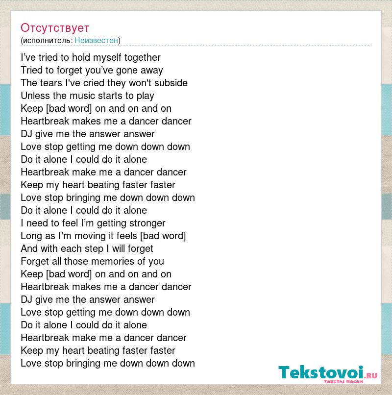 I’ve tried to hold myself together Tried to forget you’ve gone away The tears I've cried they won't subside Unless the music starts to play Keep [bad word] on and on and on Heartbreak makes me a dancer dancer DJ give me the answer answer Love stop getting me down down down Do it alone I could do it alone Heartbreak make me a dancer dancer Keep my heart beating faster faster Love stop bringing me down down down Do it alone I could do it alone I need to feel I’m getting stronger Long as I’m moving it feels [bad word] And with each step I will forget Forget all those memories of you Keep [bad word] on and on and on Heartbreak makes me a dancer dancer DJ give me the answer answer Love stop getting me down down down Do it alone I could do it alone Heartbreak make me a dancer dancer Keep my heart beating faster faster Love stop bringing me down down down
