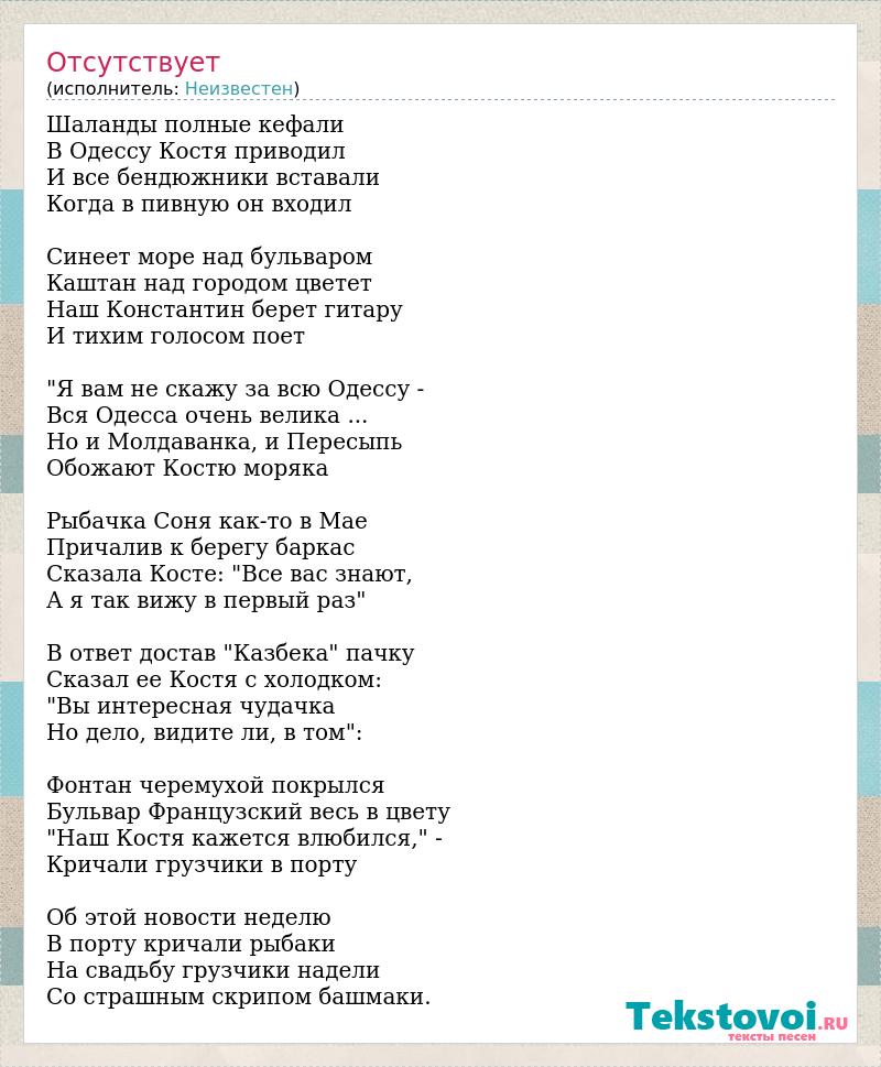 Шаланды полные кефали В Одессу Костя приводил И все бендюжники вставали Когда в пивную он входил Синеет море над бульваром Каштан над городом цветет Наш Константин берет гитару И тихим голосом поет "Я вам не скажу за всю Одессу - Вся Одесса очень велика ... Но и Молдаванка, и Пересыпь Обожают Костю моряка Рыбачка Соня как-то в Мае Причалив к берегу баркас Сказала Косте: "Все вас знают, А я так вижу в первый раз" В ответ достав "Казбека" пачку Сказал ее Костя с холодком: "Вы интересная чудачка Но дело, видите ли, в том": Фонтан черемухой покрылся Бульвар Французский весь в цвету "Наш Костя кажется влюбился," - Кричали грузчики в порту Об этой новости неделю В порту кричали рыбаки На свадьбу грузчики надели Со страшным скрипом башмаки.