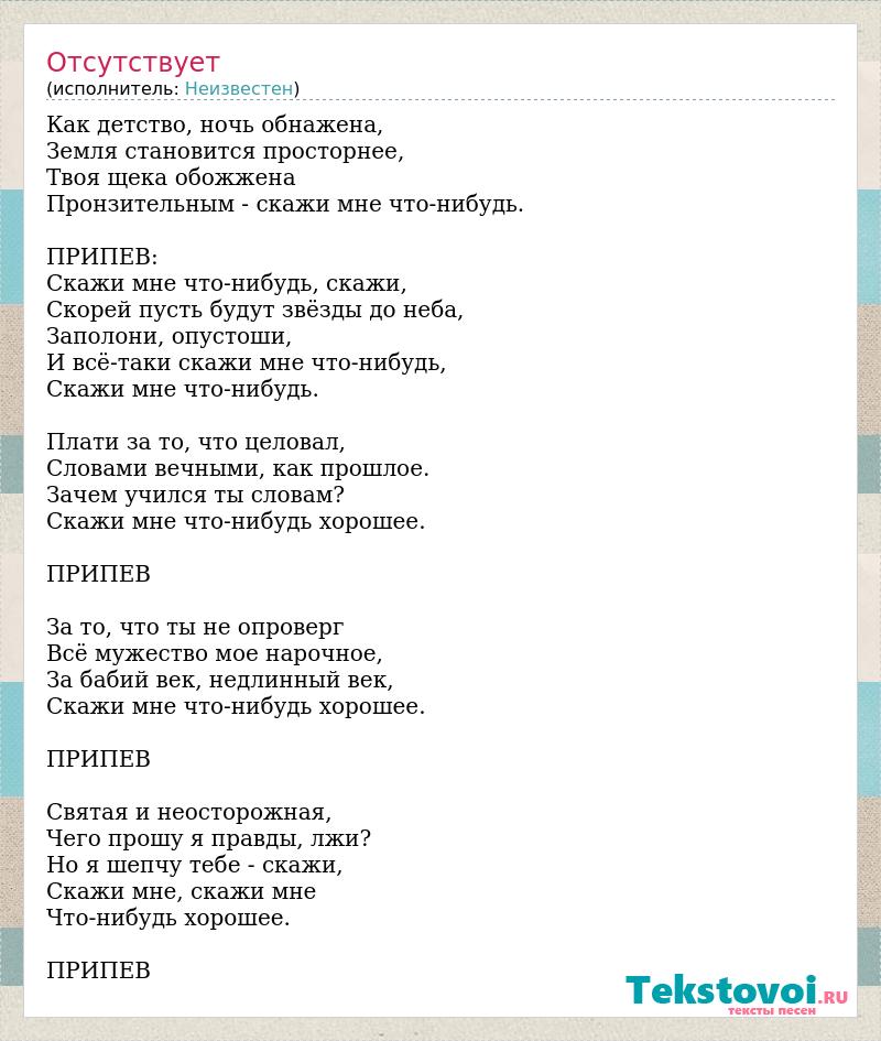 Как детство, ночь обнажена, Земля становится просторнее, Твоя щека обожжена Пронзительным - скажи мне что-нибудь. ПРИПЕВ: Скажи мне что-нибудь, скажи, Скорей пусть будут звёзды до неба, Заполони, опустоши, И всё-таки скажи мне что-нибудь, Скажи мне что-нибудь. Плати за то, что целовал, Словами вечными, как прошлое. Зачем учился ты словам? Скажи мне что-нибудь хорошее. ПРИПЕВ За то, что ты не опроверг Всё мужество мое нарочное, За бабий век, недлинный век, Скажи мне что-нибудь хорошее. ПРИПЕВ Святая и неосторожная, Чего прошу я правды, лжи? Но я шепчу тебе - скажи, Скажи мне, скажи мне Что-нибудь хорошее. ПРИПЕВ