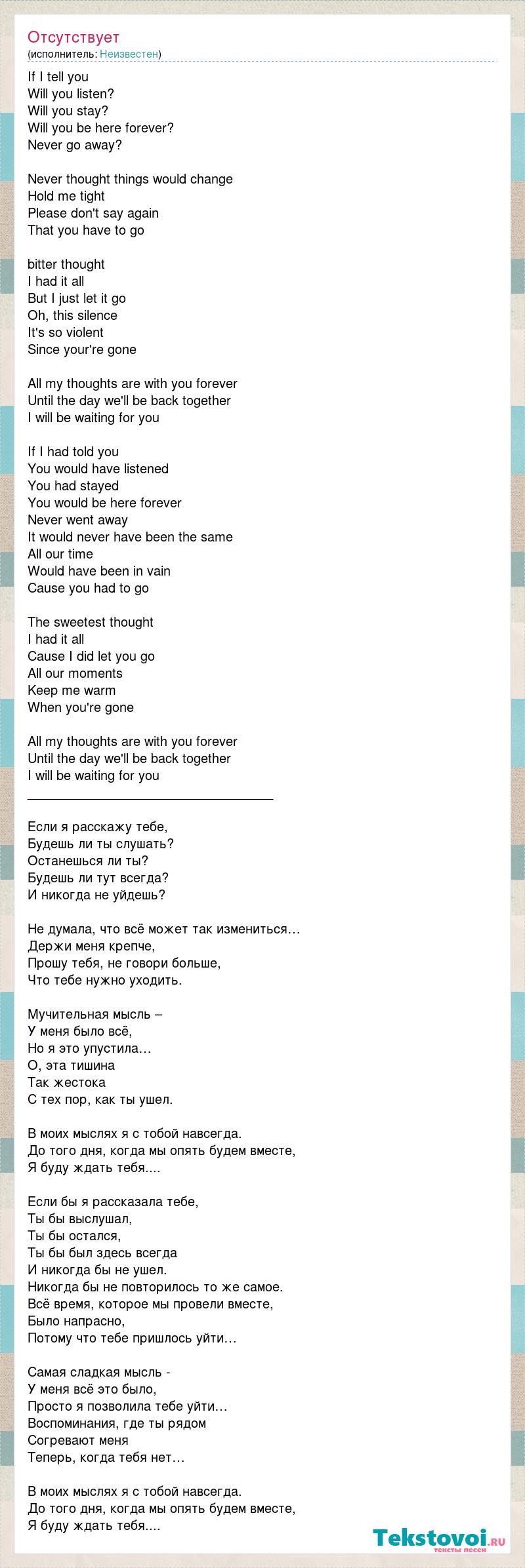If I tell you Will you listen? Will you stay? Will you be here forever? Never go away? Never thought things would change Hold me tight Please don't say again That you have to go bitter thought I had it all But I just let it go Oh, this silence It's so violent Since your're gone All my thoughts are with you forever Until the day we'll be back together I will be waiting for you If I had told you You would have listened You had stayed You would be here forever Never went away It would never have been the same All our time Would have been in vain Cause you had to go The sweetest thought I had it all Cause I did let you go All our moments Keep me warm When you're gone All my thoughts are with you forever Until the day we'll be back together I will be waiting for you __________________________________ Если я расскажу тебе, Будешь ли ты слушать? Останешься ли ты? Будешь ли тут всегда? И никогда не уйдешь? Не думала, что всё может так измениться… Держи меня крепче, Прошу тебя, не говори больше, Что тебе нужно уходить. Мучительная мысль – У меня было всё, Но я это упустила… О, эта тишина Так жестока С тех пор, как ты ушел. В моих мыслях я с тобой навсегда. До того дня, когда мы опять будем вместе, Я буду ждать тебя.... Если бы я рассказала тебе, Ты бы выслушал, Ты бы остался, Ты бы был здесь всегда И никогда бы не ушел. Никогда бы не повторилось то же самое. Всё время, которое мы провели вместе, Было напрасно, Потому что тебе пришлось уйти… Самая сладкая мысль - У меня всё это было, Просто я позволила тебе уйти… Воспоминания, где ты рядом Согревают меня Теперь, когда тебя нет… В моих мыслях я с тобой навсегда. До того дня, когда мы опять будем вместе, Я буду ждать тебя....