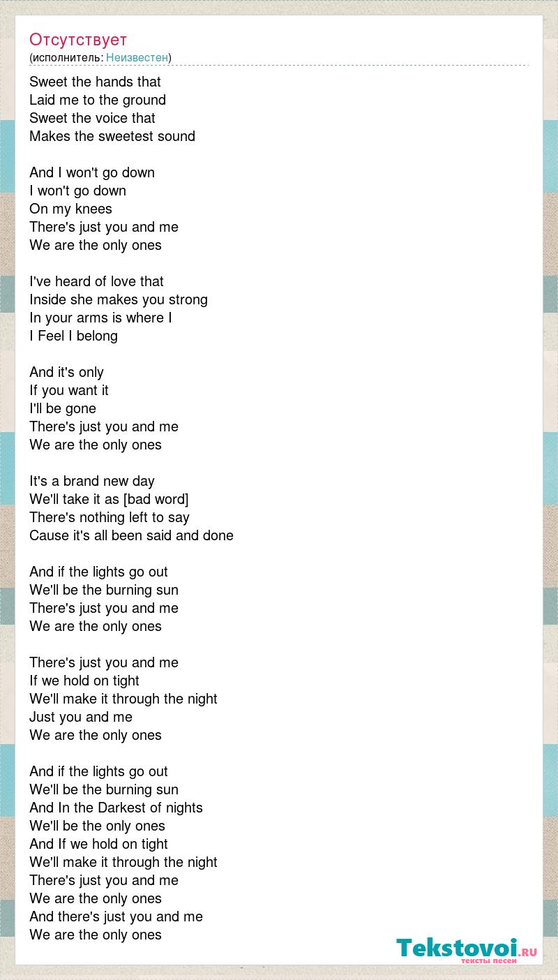 Sweet the hands that Laid me to the ground Sweet the voice that Makes the sweetest sound And I won't go down I won't go down On my knees There's just you and me We are the only ones I've heard of love that Inside she makes you strong In your arms is where I I Feel I belong And it's only If you want it I'll be gone There's just you and me We are the only ones It's a brand new day We'll take it as [bad word] There's nothing left to say Cause it's all been said and done And if the lights go out We'll be the burning sun There's just you and me We are the only ones There's just you and me If we hold on tight We'll make it through the night Just you and me We are the only ones And if the lights go out We'll be the burning sun And In the Darkest of nights We'll be the only ones And If we hold on tight We'll make it through the night There's just you and me We are the only ones And there's just you and me We are the only ones