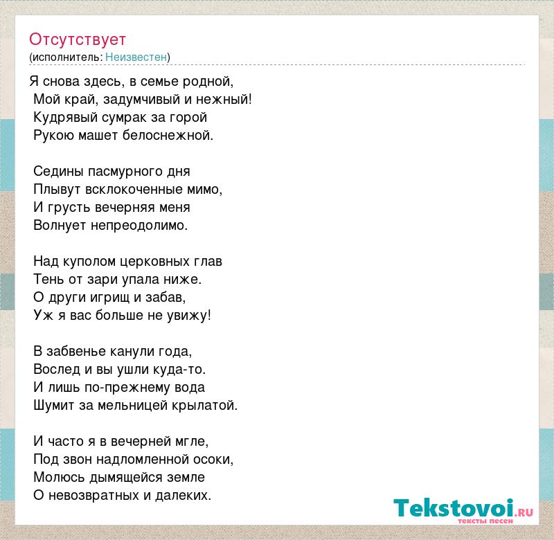 Я снова здесь, в семье родной, Мой край, задумчивый и нежный! Кудрявый сумрак за горой Рукою машет белоснежной. Седины пасмурного дня Плывут всклокоченные мимо, И грусть вечерняя меня Волнует непреодолимо. Над куполом церковных глав Тень от зари упала ниже. О други игрищ и забав, Уж я вас больше не увижу! В забвенье канули года, Вослед и вы ушли куда-то. И лишь по-прежнему вода Шумит за мельницей крылатой. И часто я в вечерней мгле, Под звон надломленной осоки, Молюсь дымящейся земле О невозвратных и далеких.
