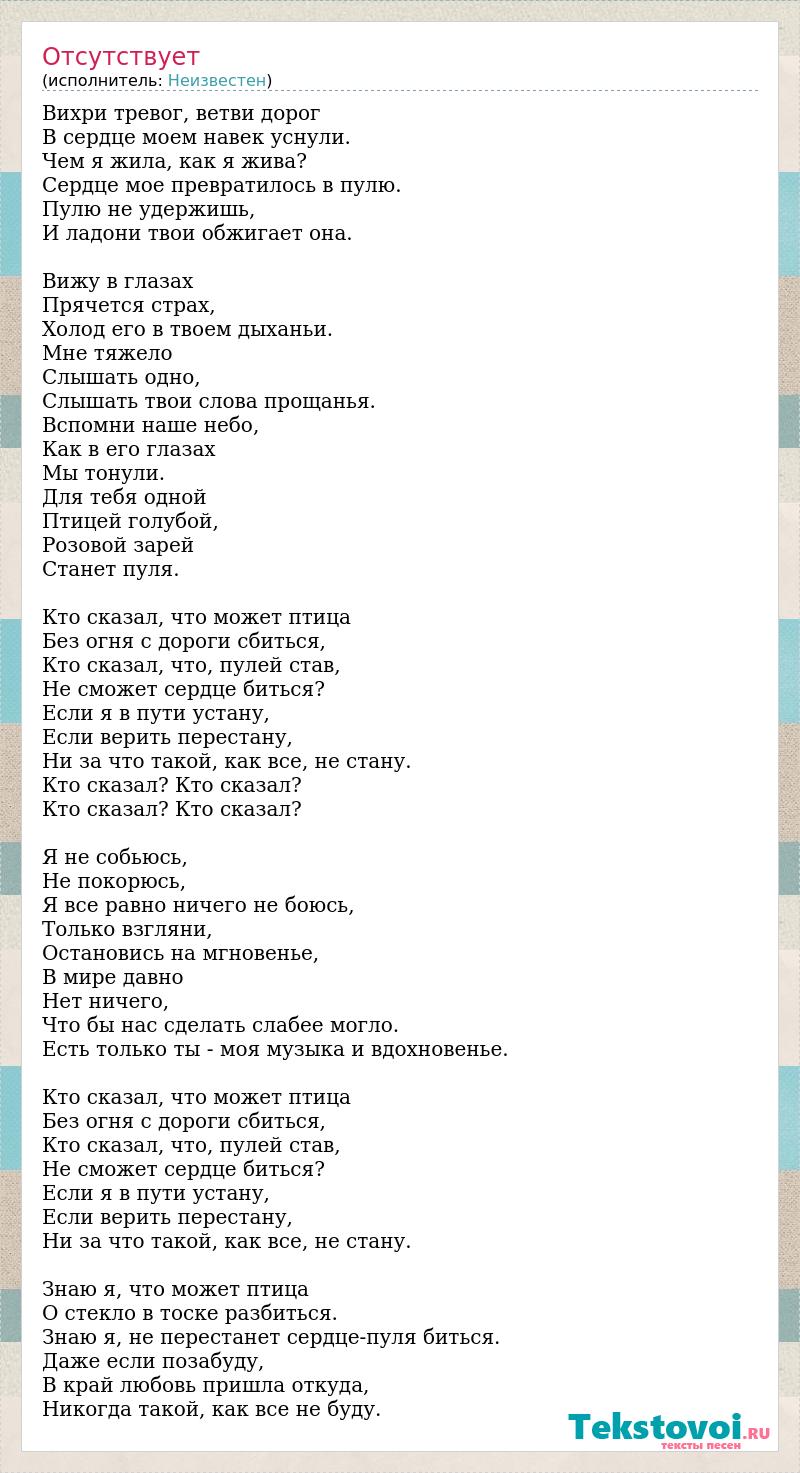 Вихри тревог, ветви дорог В сердце моем навек уснули. Чем я жила, как я жива? Сердце мое превратилось в пулю. Пулю не удержишь, И ладони твои обжигает она. Вижу в глазах Прячется страх, Холод его в твоем дыханьи. Мне тяжело Слышать одно, Слышать твои слова прощанья. Вспомни наше небо, Как в его глазах Мы тонули. Для тебя одной Птицей голубой, Розовой зарей Станет пуля. Кто сказал, что может птица Без огня с дороги сбиться, Кто сказал, что, пулей став, Не сможет сердце биться? Если я в пути устану, Если верить перестану, Ни за что такой, как все, не стану. Кто сказал? Кто сказал? Кто сказал? Кто сказал? Я не собьюсь, Не покорюсь, Я все равно ничего не боюсь, Только взгляни, Остановись на мгновенье, В мире давно Нет ничего, Что бы нас сделать слабее могло. Есть только ты - моя музыка и вдохновенье. Кто сказал, что может птица Без огня с дороги сбиться, Кто сказал, что, пулей став, Не сможет сердце биться? Если я в пути устану, Если верить перестану, Ни за что такой, как все, не стану. Знаю я, что может птица О стекло в тоске разбиться. Знаю я, не перестанет сердце-пуля биться. Даже если позабуду, В край любовь пришла откуда, Никогда такой, как все не буду.