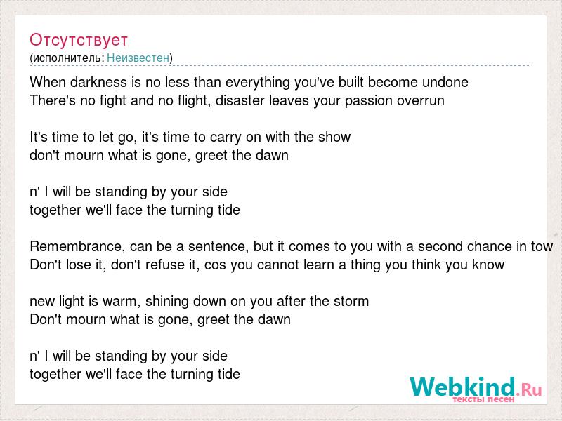 When darkness is no less than everything you've built [bad word] undone There's no fight and no flight, disaster leaves your passion [bad word] It's time to let go, it's time to carry on with the show don't mourn what is gone, greet the dawn n' I will be standing by your side together we'll face the turning tide Remembrance, can be a sentence, but [bad word] to you with a second chance in tow Don't lose it, don't refuse it, cos you cannot learn a thing you think you know new light is warm, shining down on you after the storm Don't mourn what is gone, greet the dawn n' I will be standing by your side together we'll face the turning tide