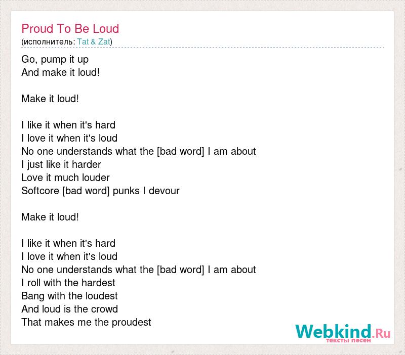 Go, pump it up And make it loud! Make it loud! I like it when it's hard I love it when it's loud No one understands what the [bad word] I am about I just like it harder Love it much louder Softcore [bad word] punks I devour Make it loud! I like it when it's hard I love it when it's loud No one understands what the [bad word] I am about I roll with the hardest Bang with the loudest And loud is the crowd That makes me the proudest