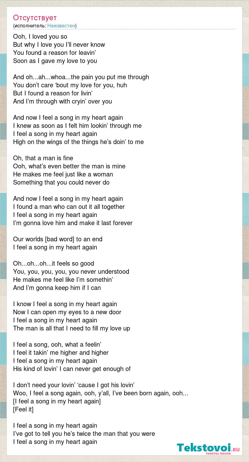 Ooh, I loved you so But why I love you I’ll never know You found a reason for leavin’ Soon as I gave my love to you And oh...ah...whoa...the pain you put me through You don’t care ‘bout my love for you, huh But I found a reason for livin’ And I’m through with cryin’ over you And now I feel a song in my heart again I knew as soon as I felt him lookin’ through me I feel a song in my heart again High on the wings of the things he’s doin’ to me Oh, that a man is fine Ooh, what’s even better the man is mine He makes me feel just like a woman Something that you could never do And now I feel a song in my heart again I found a man who can out it all together I feel a song in my heart again I’m gonna love him and make it last forever Our worlds [bad word] to an end I feel a song in my heart again Oh...oh...oh...it feels so good You, you, you, you, you never understood He makes me feel like I’m somethin’ And I’m gonna keep him if I can I know I feel a song in my heart again Now I can open my eyes to a new door I feel a song in my heart again The man is all that I need to fill my love up I feel a song, ooh, what a feelin’ I feel it takin’ me higher and higher I feel a song in my heart again His kind of lovin’ I can never get enough of I don’t need your lovin’ ‘cause I got his lovin’ Woo, I feel a song again, ooh, y’all, I’ve been born again, ooh... [I feel a song in my heart again] [Feel it] I feel a song in my heart again I’ve got to tell you he’s twice the man that you were I feel a song in my heart again