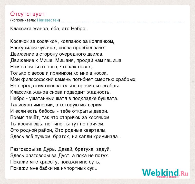 Классика жанра, ёба, это Небро.. Косячок за косячком, колпачок за колпачком, Раскурился чувачок, снова проебал зачёт. Движение в сторону очередного движа, Движение к Мише, Мишаня, продай нам гашиша. Нам на пятьсот того, что как песок, Только с весов и прямиком ко мне в носок, Мой философский камень погибнет смертью храбрых, Но перед этим основательно прочистит жабры. Классика жанра снова подводит жадность. Небро - ушатанный шатл в подкладке бушлата. Талисман империи, в которую мы верим И если есть бабосы - тебе открыты двери. Время течёт, так что старичок за косячком Ты косячнёшь, но типо ты тут не причём. Это родной район, Это родные кварталы, Здесь всё пучком, браток, ни капли криминала.. Разговоры за Дурь. Давай, братуха, задуй. Здесь разговоры за Дуст, а пока не потух. Покажи мне красоту, покажи мне суть, Покажи мне бабки на импортных сук..