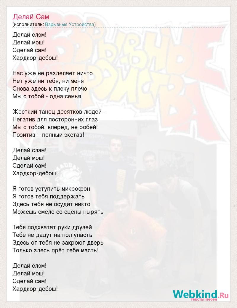 Делай слэм! Делай мош! Сделай сам! Хардкор-дебош! Нас уже не разделяет ничто Нет уже ни тебя, ни меня Снова здесь к плечу плечо Мы с тобой - одна семья Жесткий танец десятков людей - Негатив для посторонних глаз Мы с тобой, вперед, не робей! Позитив – полный экстаз! Делай слэм! Делай мош! Сделай сам! Хардкор-дебош! Я готов уступить микрофон Я готов тебя поддержать Здесь тебя не осудит никто Можешь смело со сцены нырять Тебя подхватят руки друзей Тебе не дадут на пол упасть Здесь от тебя не закроют дверь Только здесь прёт тебе масть! Делай слэм! Делай мош! Сделай сам! Хардкор-дебош!