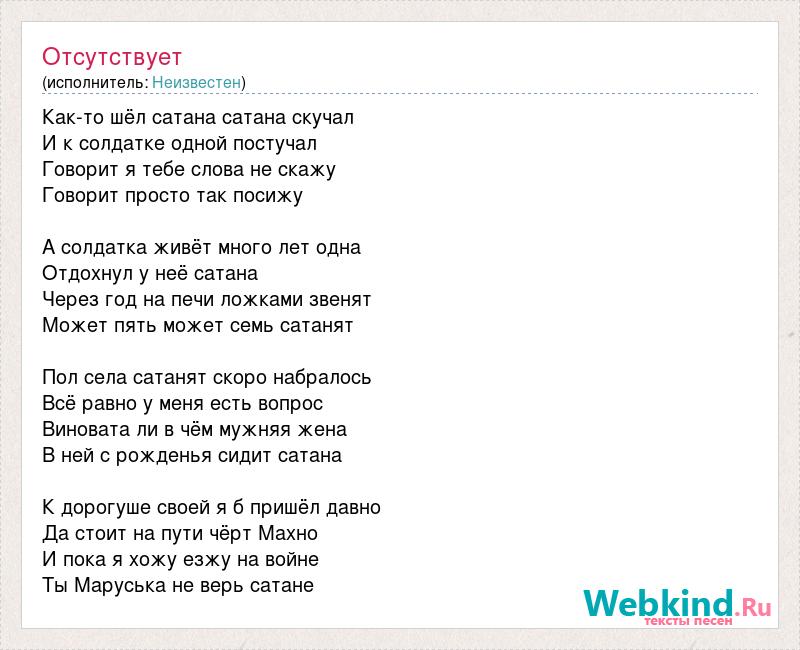 Как-то шёл сатана сатана скучал И к солдатке одной постучал Говорит я тебе слова не скажу Говорит просто так посижу А солдатка живёт много лет одна Отдохнул у неё сатана Через год на печи ложками звенят Может пять может семь сатанят Пол села сатанят скоро набралось Всё равно у меня есть вопрос Виновата ли в чём мужняя жена В ней с рожденья сидит сатана К дорогуше своей я б пришёл давно Да стоит на пути чёрт Махно И пока я хожу езжу на войне Ты Маруська не верь сатане