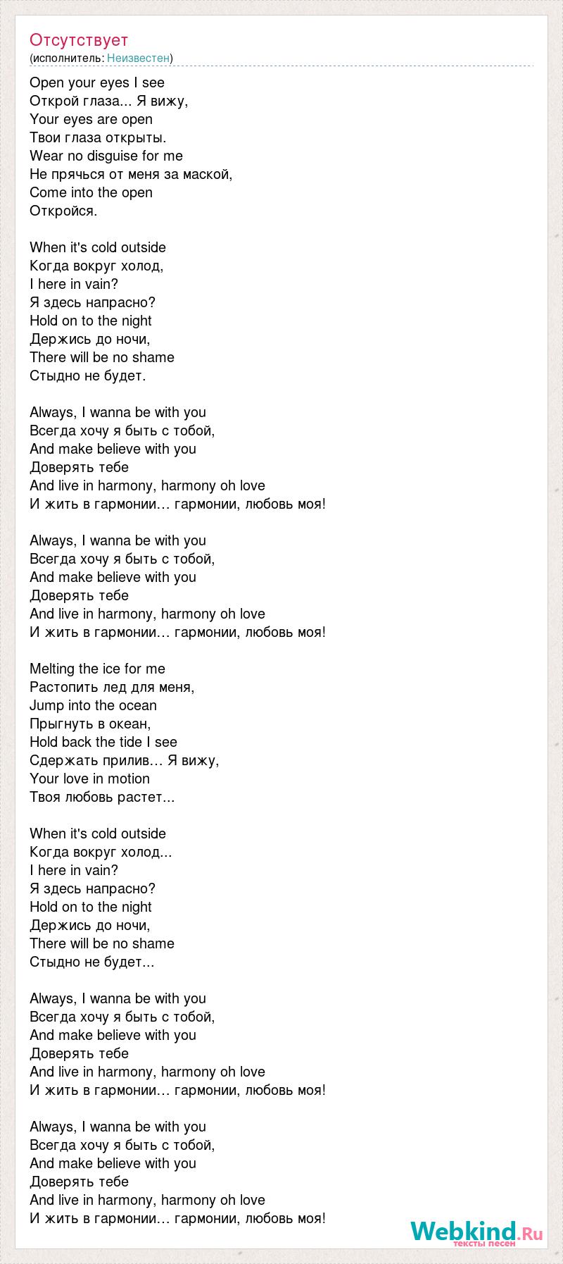 Open your eyes I see Открой глаза... Я вижу, Your eyes are open Твои глаза открыты. Wear no disguise for me Не прячься от меня за [bad word] into the open Откройся. When it's cold outside Когда вокруг холод, I here in vain? Я здесь напрасно? Hold on to the night Держись до ночи, There will be no shame Стыдно не будет. Always, I wanna be with you Всегда хочу я быть с тобой, And make believe with you Доверять тебе And live in harmony, harmony oh love И жить в гармонии… гармонии, любовь моя! Always, I wanna be with you Всегда хочу я быть с тобой, And make believe with you Доверять тебе And live in harmony, harmony oh love И жить в гармонии… гармонии, любовь моя! Melting the ice for me Растопить лед для меня, Jump into the ocean Прыгнуть в океан, Hold back the tide I see Сдержать прилив… Я вижу, Your love in motion Твоя любовь растет... When it's cold outside Когда вокруг холод... I here in vain? Я здесь напрасно? Hold on to the night Держись до ночи, There will be no shame Стыдно не будет... Always, I wanna be with you Всегда хочу я быть с тобой, And make believe with you Доверять тебе And live in harmony, harmony oh love И жить в гармонии… гармонии, любовь моя! Always, I wanna be with you Всегда хочу я быть с тобой, And make believe with you Доверять тебе And live in harmony, harmony oh love И жить в гармонии… гармонии, любовь моя!