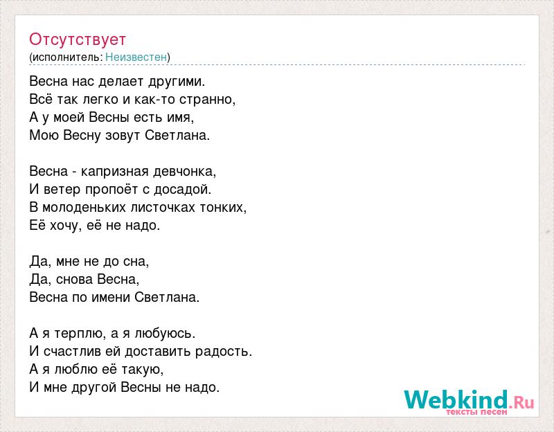 Весна нас делает другими. Всё так легко и как-то странно, А у моей Весны есть имя, Мою Весну зовут Светлана. Весна - капризная девчонка, И ветер пропоёт с досадой. В молоденьких листочках тонких, Её хочу, её не надо. Да, мне не до сна, Да, снова Весна, Весна по имени Светлана. А я терплю, а я любуюсь. И счастлив ей доставить радость. А я люблю её такую, И мне другой Весны не надо.