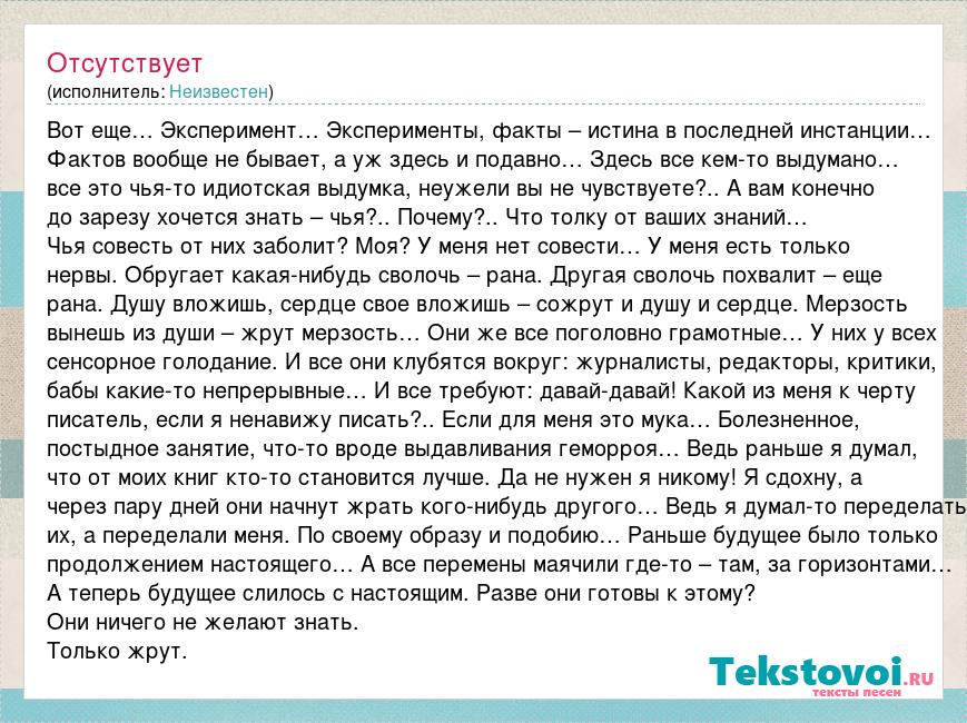 Вот еще… Эксперимент… Эксперименты, факты – истина в последней инстанции… Фактов вообще не бывает, а уж здесь и подавно… Здесь все кем-то выдумано… все это чья-то идиотская выдумка, неужели вы не чувствуете?.. А вам конечно до зарезу хочется знать – чья?.. Почему?.. Что толку от ваших знаний… Чья совесть от них заболит? Моя? У меня нет совести… У меня есть только нервы. Обругает какая-нибудь сволочь – рана. Другая сволочь похвалит – еще рана. Душу вложишь, сердце свое вложишь – сожрут и душу и сердце. Мерзость вынешь из души – жрут мерзость… Они же все поголовно грамотные… У них у всех сенсорное голодание. И все они клубятся вокруг: журналисты, редакторы, критики, бабы какие-то непрерывные… И все требуют: давай-давай! Какой из меня к черту писатель, если я ненавижу писать?.. Если для меня это мука… Болезненное, постыдное занятие, что-то вроде выдавливания геморроя… Ведь раньше я думал, что от моих книг кто-то становится лучше. Да не нужен я никому! Я сдохну, а через пару дней они начнут жрать кого-нибудь другого… Ведь я думал-то переделать их, а переделали меня. По своему образу и подобию… Раньше будущее было только продолжением настоящего… А все перемены маячили где-то – там, за горизонтами… А теперь будущее слилось с настоящим. Разве они готовы к этому? Они ничего не желают знать. Только жрут.
