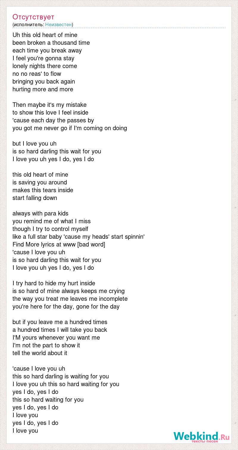 Uh this old heart of mine been broken a thousand time each time you break away I feel you're gonna stay lonely nights [bad word] no no reas' to flow bringing you back again hurting more and more Then maybe it's my mistake to show this love I feel inside 'cause each day the passes by you got me never go if [bad word] on doing but I love you uh is so hard darling this wait for you I love you uh yes I do, yes I do this old heart of mine is saving you around makes this tears inside start falling down always with para kids you remind me of what I miss though I try to control myself like a full star baby 'cause my heads' start spinnin' Find More lyrics at www [bad word] 'cause I love you uh is so hard darling this wait for you I love you uh yes I do, yes I do I try hard to hide my hurt inside is so hard of mine always keeps me crying the way you treat me leaves me [bad word] you're here for the day, gone for the day but if you leave me a hundred times a hundred times I will take you back I'M yours whenever you want me I'm not the part to show it tell the world about it 'cause I love you uh this so hard darling is waiting for you I love you uh this so hard waiting for you yes I do, yes I do this so hard waiting for you yes I do, yes I do I love you yes I do, yes I do I love you