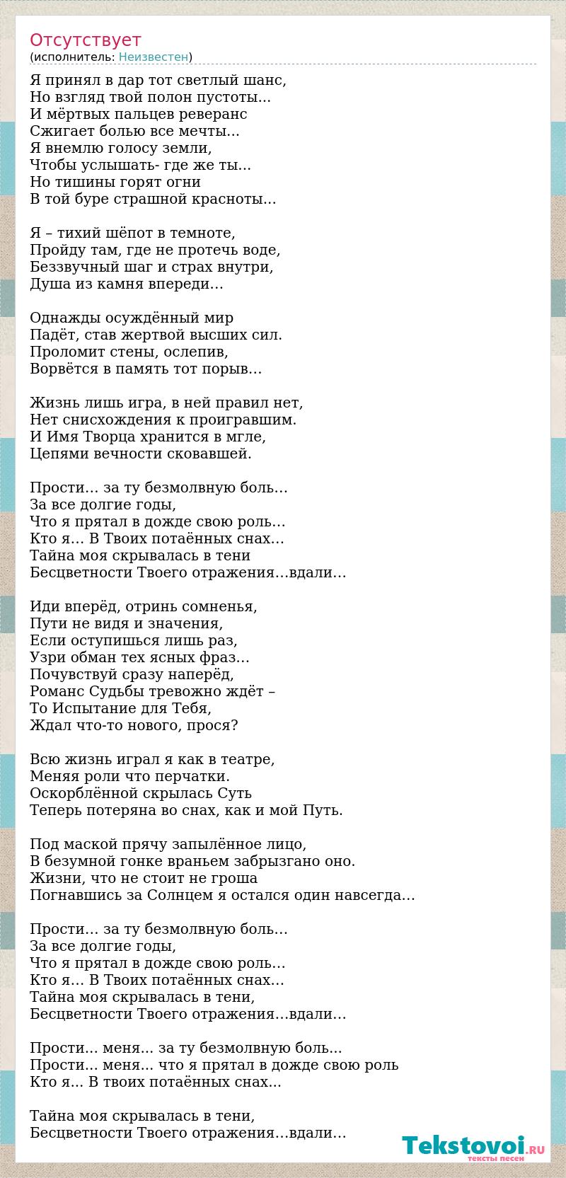 Я принял в дар тот светлый шанс, Но взгляд твой полон пустоты... И мёртвых пальцев реверанс Сжигает болью все мечты... Я внемлю голосу земли, Чтобы услышать- где же ты... Но тишины горят огни В той буре страшной красноты... Я – тихий шёпот в темноте, Пройду там, где не протечь воде, Беззвучный шаг и страх внутри, Душа из камня впереди… Однажды осуждённый мир Падёт, став жертвой высших сил. Проломит стены, ослепив, Ворвётся в память тот порыв… Жизнь лишь игра, в ней правил нет, Нет снисхождения к проигравшим. И Имя Творца хранится в мгле, Цепями вечности сковавшей. Прости… за ту безмолвную боль… За все долгие годы, Что я прятал в дожде свою роль… Кто я… В Твоих потаённых снах… Тайна моя скрывалась в тени Бесцветности Твоего отражения…вдали… Иди вперёд, отринь сомненья, Пути не видя и значения, Если оступишься лишь раз, Узри обман тех ясных фраз… Почувствуй сразу наперёд, Романс Судьбы тревожно ждёт – То Испытание для Тебя, Ждал что-то нового, прося? Всю жизнь играл я как в театре, Меняя роли что перчатки. Оскорблённой скрылась Суть Теперь потеряна во снах, как и мой Путь. Под маской прячу запылённое лицо, В безумной гонке враньем забрызгано оно. Жизни, что не стоит не гроша Погнавшись за Солнцем я остался один навсегда… Прости… за ту безмолвную боль… За все долгие годы, Что я прятал в дожде свою роль… Кто я… В Твоих потаённых снах… Тайна моя скрывалась в тени, Бесцветности Твоего отражения…вдали… Прости... меня... за ту безмолвную боль... Прости... меня... что я прятал в дожде свою роль Кто я... В твоих потаённых снах... Тайна моя скрывалась в тени, Бесцветности Твоего отражения…вдали…