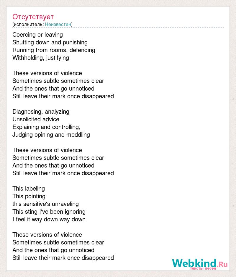 Coercing or leaving Shutting down and [bad word] from rooms, defending Withholding, justifying These versions of violence Sometimes subtle sometimes clear And the ones that go unnoticed Still leave their mark once disappeared Diagnosing, analyzing Unsolicited advice Explaining and controlling, Judging opining and meddling These versions of violence Sometimes subtle sometimes clear And the ones that go unnoticed Still leave their mark once disappeared This labeling This pointing this sensitive's unraveling This sting I've been ignoring I feel it way down way down These versions of violence Sometimes subtle sometimes clear And the ones that go unnoticed Still leave their mark once disappeared