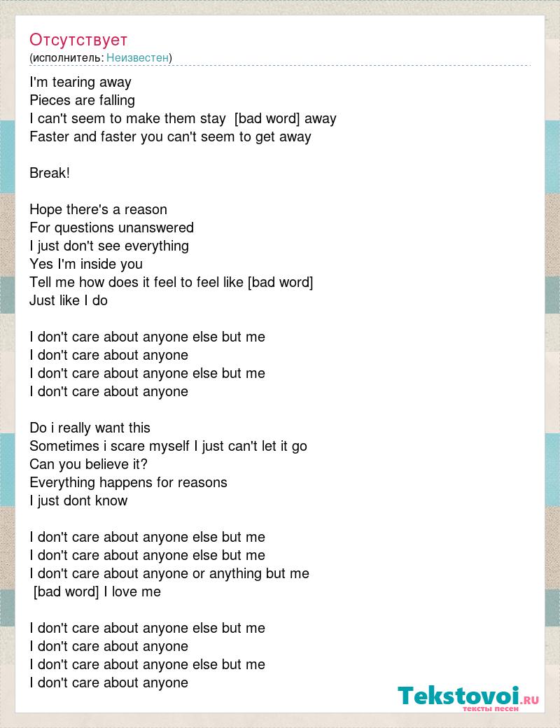 I'm tearing away Pieces are falling I can't seem to make them stay [bad word] away Faster and faster you can't seem to get away Break! Hope there's a reason For questions unanswered I just don't see everything Yes I'm inside you Tell me how does it feel to feel like [bad word] Just like I do I don't care about anyone else but me I don't care about anyone I don't care about anyone else but me I don't care about anyone Do i really want this Sometimes i scare myself I just can't let it go Can you believe it? Everything happens for reasons I just dont know I don't care about anyone else but me I don't care about anyone else but me I don't care about anyone or anything but me [bad word] I love me I don't care about anyone else but me I don't care about anyone I don't care about anyone else but me I don't care about anyone