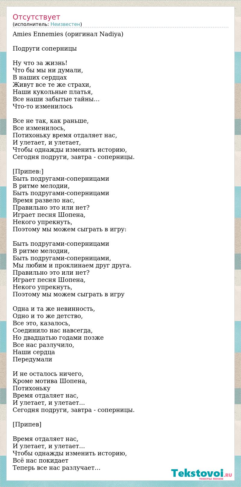Amies Ennemies (оригинал Nadiya) Подруги соперницы Ну что за жизнь! Что бы мы ни думали, В наших сердцах Живут все те же страхи, Наши кукольные платья, Все наши забытые тайны… Что-то изменилось Все не так, как раньше, Все изменилось, Потихоньку время отдаляет нас, И улетает, и улетает, Чтобы однажды изменить историю, Сегодня подруги, завтра - соперницы. [Припев:] Быть подругами-соперницами В ритме мелодии, Быть подругами-соперницами Время развело нас, Правильно это или нет? Играет песня Шопена, Некого упрекнуть, Поэтому мы можем сыграть в игру: Быть подругами-соперницами В ритме мелодии, Быть подругами-соперницами, Мы любим и проклинаем друг друга. Правильно это или нет? Играет песня Шопена, Некого упрекнуть, Поэтому мы можем сыграть в игру Одна и та же невинность, Одно и то же детство, Все это, казалось, Соединило нас навсегда, Но двадцатью годами позже Все нас разлучило, Наши сердца Передумали И не осталось ничего, Кроме мотива Шопена, Потихоньку Время отдаляет нас, И улетает, и улетает… Сегодня подруги, завтра - соперницы. [Припев] Время отдаляет нас, И улетает, и улетает… Чтобы однажды изменить историю, Всё нас покидает Теперь все нас разлучает…