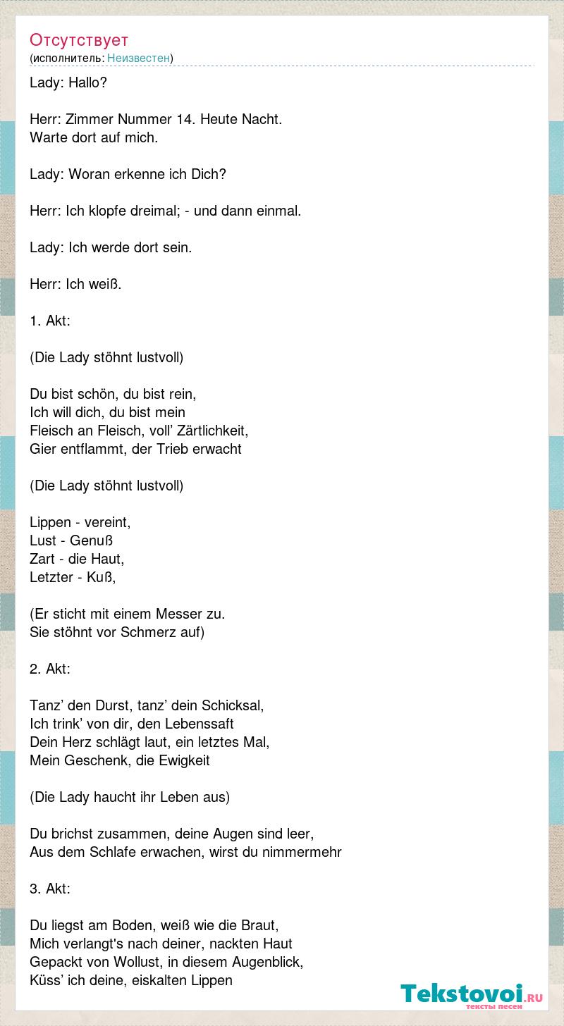Lady: Hallo? Herr: Zimmer Nummer 14. Heute Nacht. Warte dort auf mich. Lady: Woran erkenne ich Dich? Herr: Ich klopfe dreimal; - und dann einmal. Lady: Ich werde dort sein. Herr: Ich weiß. 1. Akt: (Die Lady stöhnt lustvoll) Du bist schön, du bist rein, Ich will dich, du bist mein Fleisch an Fleisch, voll’ Zärtlichkeit, Gier entflammt, der Trieb erwacht (Die Lady stöhnt lustvoll) Lippen - vereint, Lust - Genuß Zart - die Haut, Letzter - Kuß, (Er sticht mit einem Messer zu. Sie stöhnt vor Schmerz auf) 2. Akt: Tanz’ den Durst, tanz’ dein Schicksal, Ich trink’ von dir, den Lebenssaft Dein Herz schlägt laut, ein letztes Mal, Mein Geschenk, die Ewigkeit (Die Lady haucht ihr Leben aus) Du brichst zusammen, deine Augen sind leer, Aus dem Schlafe erwachen, wirst du nimmermehr 3. Akt: Du liegst am Boden, weiß wie die Braut, Mich verlangt's nach deiner, nackten Haut Gepackt von Wollust, in diesem Augenblick, Küss’ ich deine, eiskalten Lippen