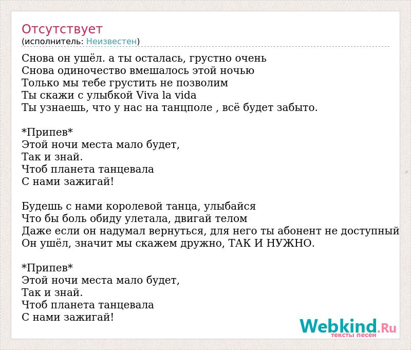 Снова он ушёл. а ты осталась, грустно очень Снова одиночество вмешалось этой ночью Только мы тебе грустить не позволим Ты скажи с улыбкой Viva la vida Ты узнаешь, что у нас на танцполе , всё будет забыто. *Припев* Этой ночи места мало будет, Так и знай. Чтоб планета танцевала С нами зажигай! Будешь с нами королевой танца, улыбайся Что бы боль обиду улетала, двигай телом Даже если он надумал вернуться, для него ты абонент не доступный Он ушёл, значит мы скажем дружно, ТАК И НУЖНО. *Припев* Этой ночи места мало будет, Так и знай. Чтоб планета танцевала С нами зажигай!