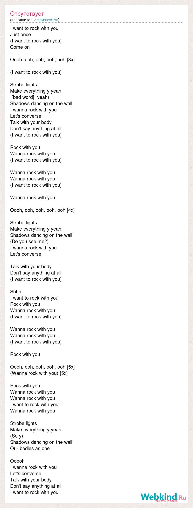 I want to rock with you Just once (I want to rock with [bad word] on Oooh, ooh, ooh, ooh, ooh [3x] (I want to rock with you) Strobe lights Make everything y yeah [bad word] yeah) Shadows dancing on the wall I wanna rock with you Let's converse Talk with your body Don't say anything at all (I want to rock with you) Rock with you Wanna rock with you (I want to rock with you) Wanna rock with you Wanna rock with you (I want to rock with you) Wanna rock with you Oooh, ooh, ooh, ooh, ooh [4x] Strobe lights Make everything y yeah Shadows dancing on the wall (Do you see me?) I wanna rock with you Let's converse Talk with your body Don't say anything at all (I want to rock with you) Shhh I want to rock with you Rock with you Wanna rock with you (I want to rock with you) Wanna rock with you Wanna rock with you (I want to rock with you) Rock with you Oooh, ooh, ooh, ooh, ooh [5x] (Wanna rock with you) [5x] Rock with you Wanna rock with you Wanna rock with you I want to rock with you Wanna rock with you Strobe lights Make everything y yeah (So y) Shadows dancing on the wall Our bodies as one Ooooh I wanna rock with you Let's converse Talk with your body Don't say anything at all I want to rock with you