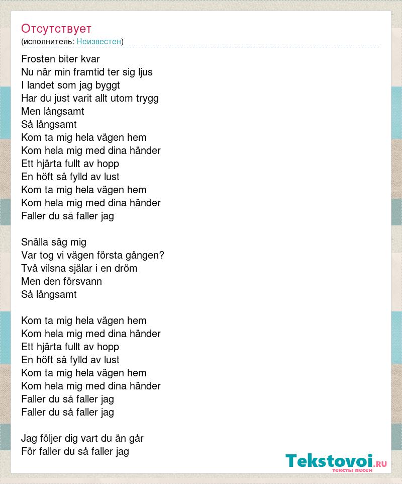 Frosten biter kvar Nu när min framtid ter sig ljus I landet som jag byggt Har du just varit allt utom trygg Men långsamt Så långsamt Kom ta mig hela vägen hem Kom hela mig med dina händer Ett hjärta fullt av hopp En höft så fylld av lust Kom ta mig hela vägen hem Kom hela mig med dina händer Faller du så faller jag Snälla säg mig Var tog vi vägen första gången? Två vilsna själar i en dröm Men den försvann Så långsamt Kom ta mig hela vägen hem Kom hela mig med dina händer Ett hjärta fullt av hopp En höft så fylld av lust Kom ta mig hela vägen hem Kom hela mig med dina händer Faller du så faller jag Faller du så faller jag Jag följer dig vart du än går För faller du så faller jag