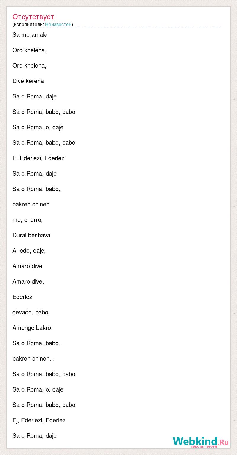 Sa me amala Oro khelena, Oro khelena, Dive kerena Sa o Roma, daje Sa o Roma, babo, babo Sa o Roma, o, daje Sa o Roma, babo, babo E, Ederlezi, Ederlezi Sa o Roma, daje Sa o Roma, babo, bakren chinen me, chorro, Dural beshava A, odo, daje, Amaro dive Amaro dive, Ederlezi devado, babo, Amenge bakro! Sa o Roma, babo, bakren chinen... Sa o Roma, babo, babo Sa o Roma, o, daje Sa o Roma, babo, babo Ej, Ederlezi, Ederlezi Sa o Roma, daje