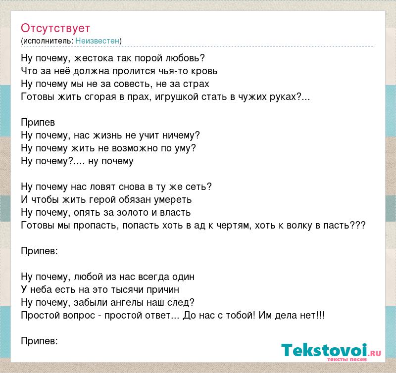 Ну почему, жестока так порой любовь? Что за неё должна пролится чья-то кровь Ну почему мы не за совесть, не за страх Готовы жить сгорая в прах, игрушкой стать в чужих руках?... Припев Ну почему, нас жизнь не учит ничему? Ну почему жить не возможно по уму? Ну почему?.... ну почему Ну почему нас ловят снова в ту же сеть? И чтобы жить герой обязан умереть Ну почему, опять за золото и власть Готовы мы пропасть, попасть хоть в ад к чертям, хоть к волку в пасть??? Припев: Ну почему, любой из нас всегда один У неба есть на это тысячи причин Ну почему, забыли ангелы наш след? Простой вопрос - простой ответ... До нас с тобой! Им дела нет!!! Припев: