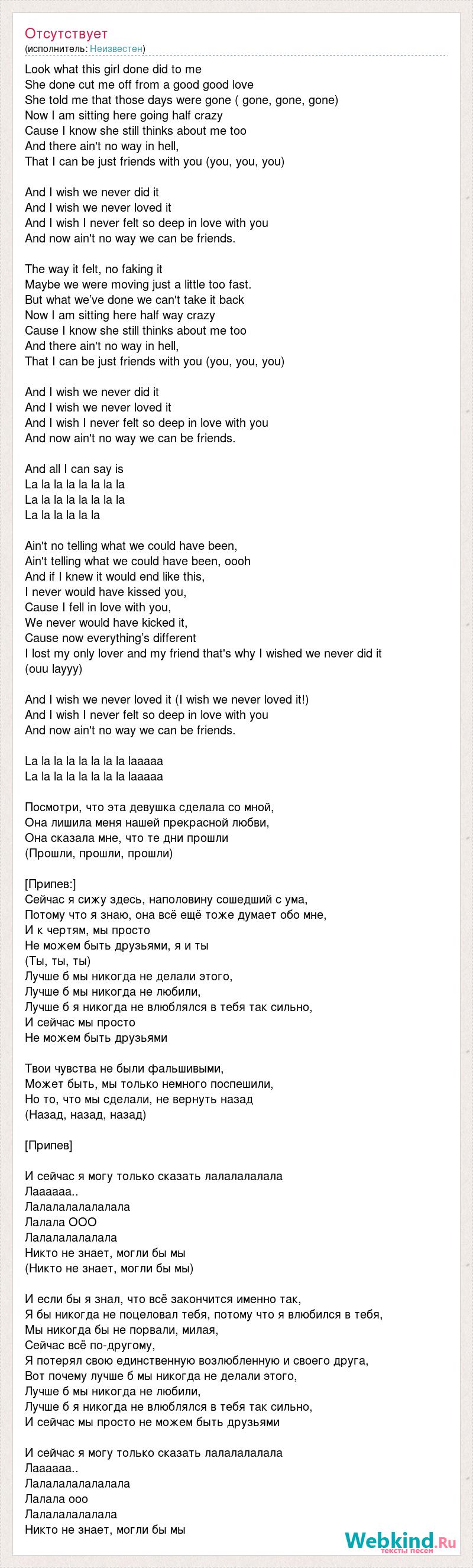 Look what this girl done did to me She done cut me off from a good good love She told me that those days were gone ( gone, gone, gone) Now I am sitting here going half crazy Cause I know she still thinks about me too And there ain't no way in [bad word] That I can be just friends with you (you, you, you) And I wish we never did it And I wish we never loved it And I wish I never felt so deep in love with you And now ain't no way we can be friends. The way it felt, no faking it Maybe we were moving just a little too fast. But what we’ve done we can't take it back Now I am sitting here half way crazy Cause I know she still thinks about me too And there ain't no way in [bad word] That I can be just friends with you (you, you, you) And I wish we never did it And I wish we never loved it And I wish I never felt so deep in love with you And now ain't no way we can be friends. And all I can say is La la la la la la la la La la la la la la la la La la la la la la Ain't no telling what we could have been, Ain't telling what we could have been, oooh And if I knew it would end like this, I never would have kissed you, Cause I fell in love with you, We never would have kicked it, Cause now everything’s different I lost my only lover and my friend that's why I wished we never did it (ouu layyy) And I wish we never loved it (I wish we never loved it!) And I wish I never felt so deep in love with you And now ain't no way we can be friends. La la la la la la la la laaaaa La la la la la la la la laaaaa Посмотри, что эта девушка сделала со мной, Она лишила меня нашей прекрасной любви, Она сказала мне, что те дни прошли (Прошли, прошли, прошли) [Припев:] Сейчас я сижу здесь, наполовину сошедший с ума, Потому что я знаю, она всё ещё тоже думает обо мне, И к чертям, мы просто Не можем быть друзьями, я и ты (Ты, ты, ты) Лучше б мы никогда не делали этого, Лучше б мы никогда не любили, Лучше б я никогда не влюблялся в тебя так сильно, И сейчас мы просто Не можем быть друзьями Твои чувства не были фальшивыми, Может быть, мы только немного поспешили, Но то, что мы сделали, не вернуть назад (Назад, назад, назад) [Припев] И сейчас я могу только сказать лалалалалала Лаааааа.. Лалалалалалалала Лалала ООО Лалалалалалала Никто не знает, могли бы мы (Никто не знает, могли бы мы) И если бы я знал, что всё закончится именно так, Я бы никогда не поцеловал тебя, потому что я влюбился в тебя, Мы никогда бы не порвали, милая, Сейчас всё по-другому, Я потерял свою единственную возлюбленную и своего друга, Вот почему лучше б мы никогда не делали этого, Лучше б мы никогда не любили, Лучше б я никогда не влюблялся в тебя так сильно, И сейчас мы просто не можем быть друзьями И сейчас я могу только сказать лалалалалала Лаааааа.. Лалалалалалалала Лалала ооо Лалалалалалала Никто не знает, могли бы мы