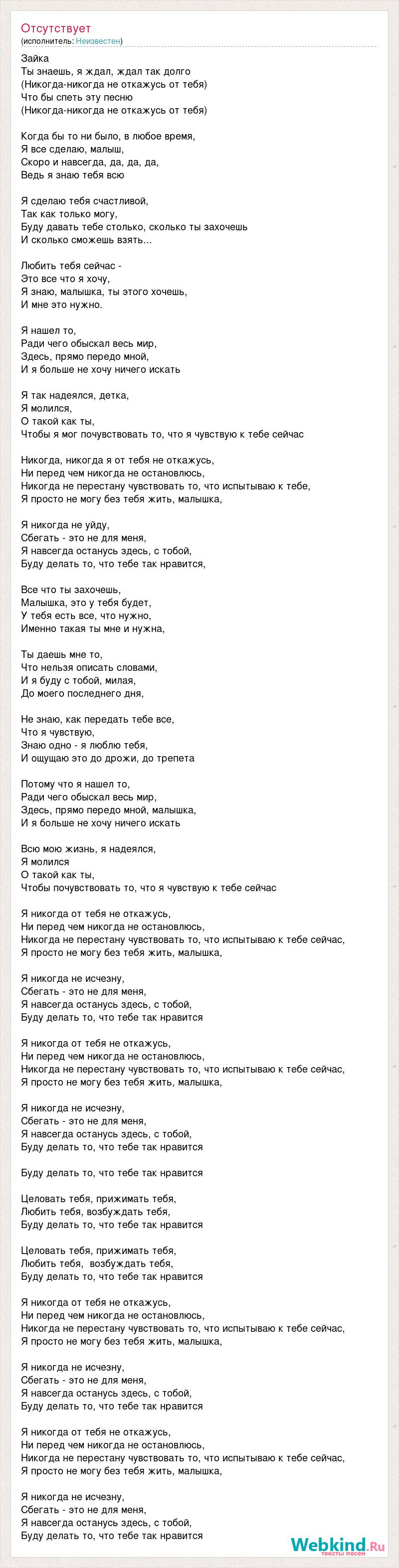 Зайка Ты знаешь, я ждал, ждал так долго (Никогда-никогда не откажусь от тебя) Что бы спеть эту песню (Никогда-никогда не откажусь от тебя) Когда бы то ни было, в любое время, Я все сделаю, малыш, Скоро и навсегда, да, да, да, Ведь я знаю тебя всю Я сделаю тебя счастливой, Так как только могу, Буду давать тебе столько, сколько ты захочешь И сколько сможешь взять... Любить тебя сейчас - Это все что я хочу, Я знаю, малышка, ты этого хочешь, И мне это нужно. Я нашел то, Ради чего обыскал весь мир, Здесь, прямо передо мной, И я больше не хочу ничего искать Я так надеялся, детка, Я молился, О такой как ты, Чтобы я мог почувствовать то, что я чувствую к тебе сейчас Никогда, никогда я от тебя не откажусь, Ни перед чем никогда не остановлюсь, Никогда не перестану чувствовать то, что испытываю к тебе, Я просто не могу без тебя жить, малышка, Я никогда не уйду, Сбегать - это не для меня, Я навсегда останусь здесь, с тобой, Буду делать то, что тебе так нравится, Все что ты захочешь, Малышка, это у тебя будет, У тебя есть все, что нужно, Именно такая ты мне и нужна, Ты даешь мне то, Что нельзя описать словами, И я буду с тобой, милая, До моего последнего дня, Не знаю, как передать тебе все, Что я чувствую, Знаю одно - я люблю тебя, И ощущаю это до дрожи, до трепета Потому что я нашел то, Ради чего обыскал весь мир, Здесь, прямо передо мной, малышка, И я больше не хочу ничего искать Всю мою жизнь, я надеялся, Я молился О такой как ты, Чтобы почувствовать то, что я чувствую к тебе сейчас Я никогда от тебя не откажусь, Ни перед чем никогда не остановлюсь, Никогда не перестану чувствовать то, что испытываю к тебе сейчас, Я просто не могу без тебя жить, малышка, Я никогда не исчезну, Сбегать - это не для меня, Я навсегда останусь здесь, с тобой, Буду делать то, что тебе так нравится Я никогда от тебя не откажусь, Ни перед чем никогда не остановлюсь, Никогда не перестану чувствовать то, что испытываю к тебе сейчас, Я просто не могу без тебя жить, малышка, Я никогда не исчезну, Сбегать - это не для меня, Я навсегда останусь здесь, с тобой, Буду делать то, что тебе так нравится Буду делать то, что тебе так нравится Целовать тебя, прижимать тебя, Любить тебя, возбуждать тебя, Буду делать то, что тебе так нравится Целовать тебя, прижимать тебя, Любить тебя, возбуждать тебя, Буду делать то, что тебе так нравится Я никогда от тебя не откажусь, Ни перед чем никогда не остановлюсь, Никогда не перестану чувствовать то, что испытываю к тебе сейчас, Я просто не могу без тебя жить, малышка, Я никогда не исчезну, Сбегать - это не для меня, Я навсегда останусь здесь, с тобой, Буду делать то, что тебе так нравится Я никогда от тебя не откажусь, Ни перед чем никогда не остановлюсь, Никогда не перестану чувствовать то, что испытываю к тебе сейчас, Я просто не могу без тебя жить, малышка, Я никогда не исчезну, Сбегать - это не для меня, Я навсегда останусь здесь, с тобой, Буду делать то, что тебе так нравится