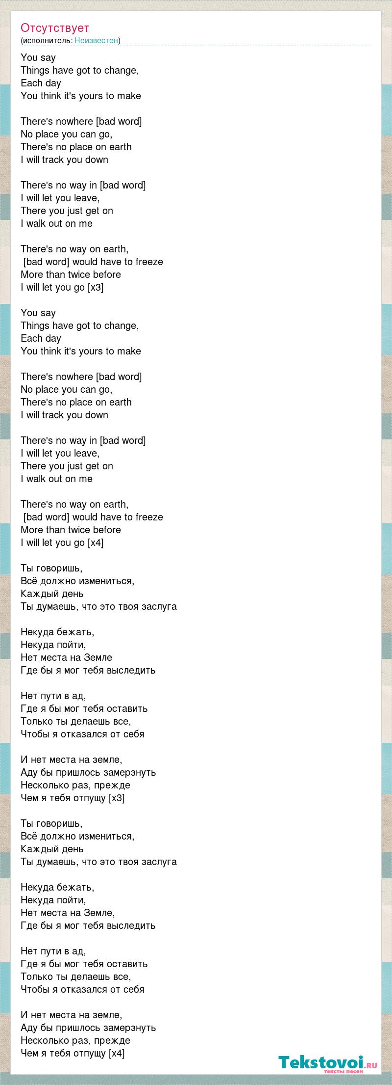 You say Things have got to change, Each day You think it's yours to make There's nowhere [bad word] No place you can go, There's no place on earth I will track you down There's no way in [bad word] I will let you leave, There you just get on I walk out on me There's no way on earth, [bad word] would have to freeze More than twice before I will let you go [x3] You say Things have got to change, Each day You think it's yours to make There's nowhere [bad word] No place you can go, There's no place on earth I will track you down There's no way in [bad word] I will let you leave, There you just get on I walk out on me There's no way on earth, [bad word] would have to freeze More than twice before I will let you go [x4] Ты говоришь, Всё должно измениться, Каждый день Ты думаешь, что это твоя заслуга Некуда бежать, Некуда пойти, Нет места на Земле Где бы я мог тебя выследить Нет пути в ад, Где я бы мог тебя оставить Только ты делаешь все, Чтобы я отказался от себя И нет места на земле, Аду бы пришлось замерзнуть Несколько раз, прежде Чем я тебя отпущу [x3] Ты говоришь, Всё должно измениться, Каждый день Ты думаешь, что это твоя заслуга Некуда бежать, Некуда пойти, Нет места на Земле, Где бы я мог тебя выследить Нет пути в ад, Где я бы мог тебя оставить Только ты делаешь все, Чтобы я отказался от себя И нет места на земле, Аду бы пришлось замерзнуть Несколько раз, прежде Чем я тебя отпущу [x4]