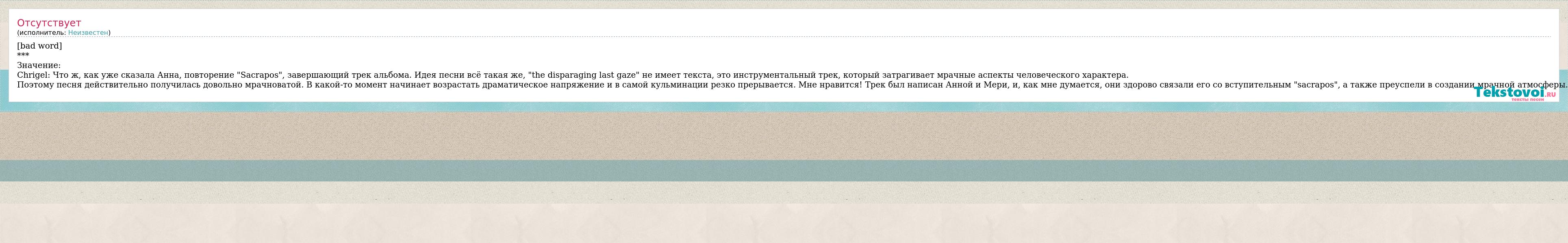 [bad word] *** Значение: Chrigel: Что ж, как уже сказала Анна, повторение "Sacrapos", завершающий трек альбома. Идея песни всё такая же, "the disparaging last gaze" не имеет текста, это инструментальный трек, который затрагивает мрачные аспекты человеческого характера. Поэтому песня действительно получилась довольно мрачноватой. В какой-то момент начинает возрастать драматическое напряжение и в самой кульминации резко прерывается. Мне нравится! Трек был написан Анной и Мери, и, как мне думается, они здорово связали его со вступительным "sacrapos", а также преуспели в создании мрачной атмосферы.