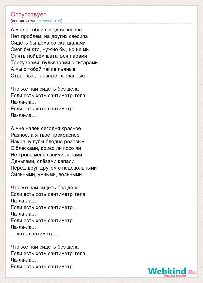 А мне с тобой сегодня весело Нет проблем, на других свесила Сидеть бы дома со скандалами Смог бы кто, нужно бы, но не мы Опять пойдём шататься парами Тротуарами, бульварами с гитарами А мы с тобой такие пьяные Странные, главные, желанные Что же нам сидеть без дела Если есть хоть сантиметр тела Ла-ла-ла... Если есть хоть сантиметр... Ла-ла-ла... А мне налей сегодня красное Разное, а я твоё прекрасное Накрашу губы бледно розовым С блесками, криво ли косо ли Не тронь меня своими лапами Деньгами, слёзами капали Перед друг другом с недовольными Сильными, умными, вольными Что же нам сидеть без дела Если есть хоть сантиметр тела Ла-ла-ла... Если есть хоть сантиметр... Ла-ла-ла... Если есть хоть сантиметр... Ла-ла-ла... ... хоть сантиметр... Что же нам сидеть без дела Если есть хоть сантиметр тела Ла-ла-ла... Если есть хоть сантиметр...