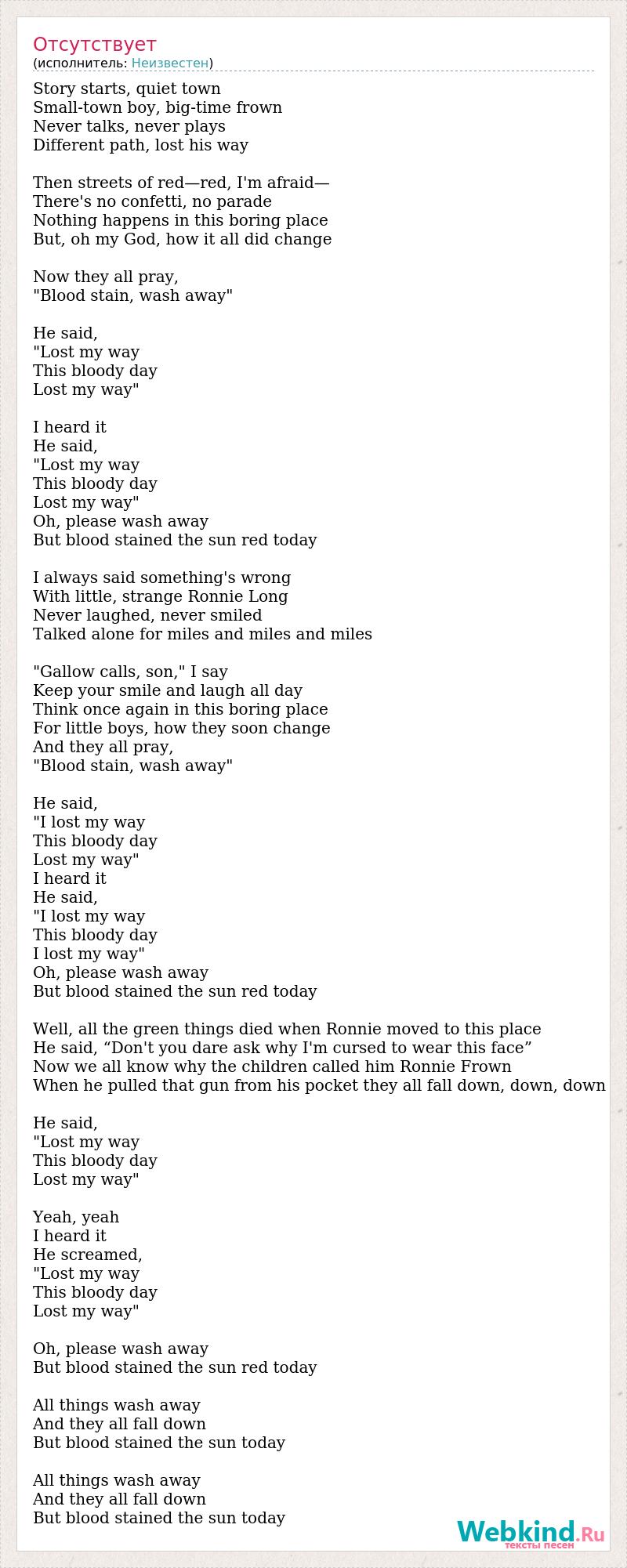 Story starts, quiet town Small-town boy, big-time frown Never talks, never plays Different path, lost his way Then streets of red—red, I'm afraid— There's no confetti, no parade Nothing happens in this boring place But, oh my God, how it all did change Now they all pray, "Blood stain, wash away" He said, "Lost my way This bloody day Lost my way" I heard it He said, "Lost my way This bloody day Lost my way" Oh, please wash away But blood stained the sun red today I always said something's wrong With little, strange Ronnie Long Never laughed, never smiled Talked alone for miles and miles and miles "Gallow calls, son," I say Keep your smile and laugh all day Think once again in this boring place For little boys, how they soon change And they all pray, "Blood stain, wash away" He said, "I lost my way This bloody day Lost my way" I heard it He said, "I lost my way This bloody day I lost my way" Oh, please wash away But blood stained the sun red today Well, all the green things died when Ronnie moved to this place He said, “Don't you dare ask why I'm cursed to wear this face” Now we all know why the children called him Ronnie Frown When he pulled that gun from his pocket they all fall down, down, down He said, "Lost my way This bloody day Lost my way" Yeah, yeah I heard it He screamed, "Lost my way This bloody day Lost my way" Oh, please wash away But blood stained the sun red today All things wash away And they all fall down But blood stained the sun today All things wash away And they all fall down But blood stained the sun today