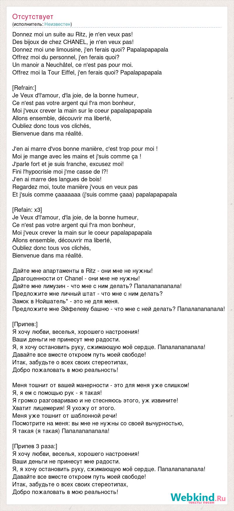 Donnez moi un suite au Ritz, je n'en veux pas! Des bijoux de chez CHANEL, je n'en veux pas! Donnez moi une limousine, j'en ferais quoi? Papalapapapala Offrez moi du personnel, j'en ferais quoi? Un manoir a Neuchâtel, ce n'est pas pour moi. Offrez moi la Tour Eiffel, j'en ferais quoi? Papalapapapala [Refrain:] Je Veux d'l'amour, d'la joie, de la bonne humeur, Ce n'est pas votre argent qui f'ra mon bonheur, Moi j'veux crever la main sur le coeur papalapapapala Allons ensemble, découvrir ma liberté, Oubliez donc tous vos clichés, Bienvenue dans ma réalité. J'en ai marre d'vos bonne manière, c'est trop pour moi ! Moi je mange avec les mains et [bad word] ça ! J'parle fort et je suis franche, excusez moi! Fini l'hypocrisie moi j'me casse de l?! J'en ai marre des langues de bois! Regardez moi, toute manière j'vous en veux pas Et [bad word] çaaaaaaa [bad word] çaaa) papalapapapala [Refain: x3] Je Veux d'l'amour, d'la joie, de la bonne humeur, Ce n'est pas votre argent qui f'ra mon bonheur, Moi j'veux crever la main sur le coeur papalapapapala Allons ensemble, découvrir ma liberté, Oubliez donc tous vos clichés, Bienvenue dans ma réalité. Дайте мне апартаменты в Ritz - они мне не нужны! Драгоценности от Chanel - они мне не нужны! Дайте мне лимузин - что мне с ним делать? Папалапапапала! Предложите мне личный штат - что мне с ним делать? Замок в Нойшатель* - это не для меня. Предложите мне Эйфелеву башню - что мне с ней делать? Папалапапапала! [Припев:] Я хочу любви, веселья, хорошего настроения! Ваши деньги не принесут мне радости. Я, я хочу остановить руку, сжимающую моё сердце. Папалапапапала! Давайте все вместе откроем путь моей свободе! Итак, забудьте о всех своих стереотипах, Добро пожаловать в мою реальность! Меня тошнит от вашей манерности - это для меня уже слишком! Я, я ем с помощью рук - я такая! Я громко разговариваю и не стесняюсь этого, уж извините! Хватит лицемерия! Я ухожу от этого. Меня уже тошнит от шаблонной речи! Посмотрите на меня: вы мне не нужны со своей вычурностью, Я такая (я такая) Папалапапапала! [Припев 3 раза:] Я хочу любви, веселья, хорошего настроения! Ваши деньги не принесут мне радости. Я, я хочу остановить руку, сжимающую моё сердце. Папалапапапала! Давайте все вместе откроем путь моей свободе! Итак, забудьте о всех своих стереотипах, Добро пожаловать в мою реальность!
