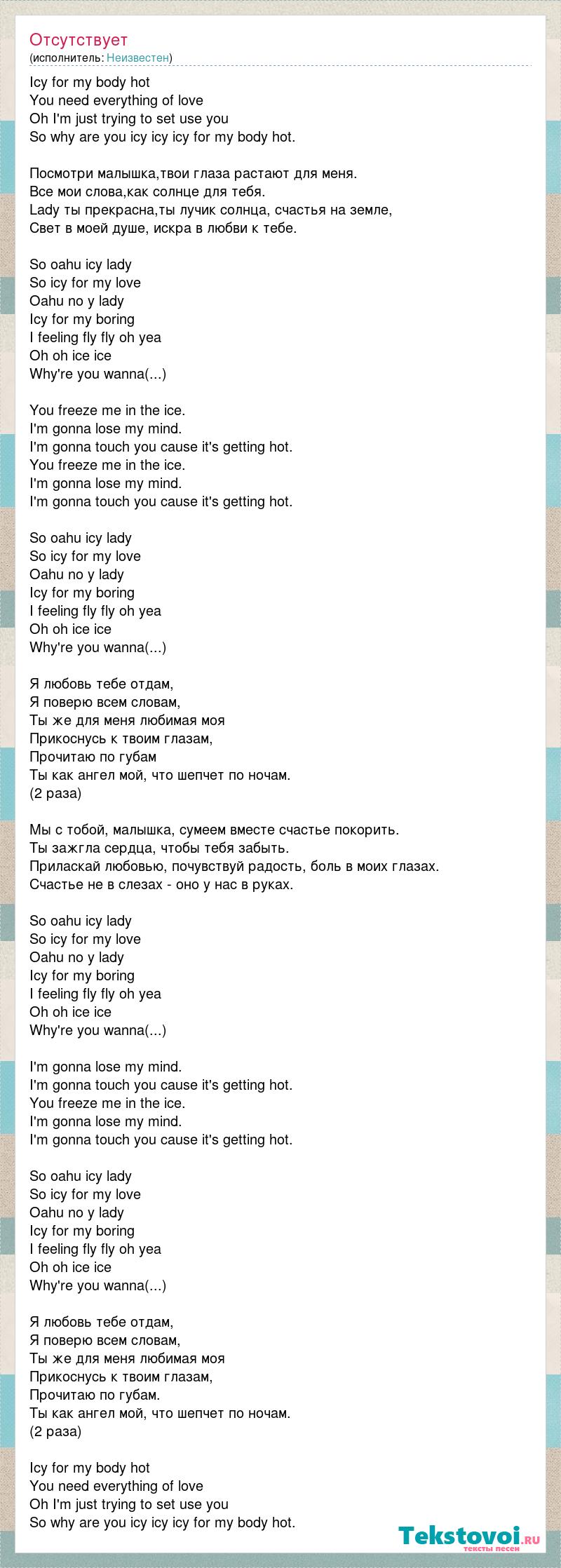 Icy for my body hot You need everything of love Oh I'm just trying to set use you So why are you icy icy icy for my body hot. Посмотри малышка,твои глаза растают для меня. Все мои слова,как солнце для тебя. Lady ты прекрасна,ты лучик солнца, счастья на земле, Свет в моей душе, искра в любви к тебе. So оahu icy lady So icy for my love Oahu no y lady Icy for my boring I feeling fly fly oh yea Oh oh ice ice Why're you wanna(...) You freeze me in the ice. I'm gonna lose my mind. I'm gonna touch you cause it's getting hot. You freeze me in the ice. I'm gonna lose my mind. I'm gonna touch you cause it's getting hot. So оahu icy lady So icy for my love Oahu no y lady Icy for my boring I feeling fly fly oh yea Oh oh ice ice Why're you wanna(...) Я любовь тебе отдам, Я поверю всем словам, Ты же для меня любимая моя Прикоснусь к твоим глазам, Прочитаю по губам Ты как ангел мой, что шепчет по ночам. (2 раза) Мы с тобой, малышка, сумеем вместе счастье покорить. Ты зажгла сердца, чтобы тебя забыть. Приласкай любовью, почувствуй радость, боль в моих глазах. Счастье не в слезах - оно у нас в руках. So оahu icy lady So icy for my love Oahu no y lady Icy for my boring I feeling fly fly oh yea Oh oh ice ice Why're you wanna(...) I'm gonna lose my mind. I'm gonna touch you cause it's getting hot. You freeze me in the ice. I'm gonna lose my mind. I'm gonna touch you cause it's getting hot. So оahu icy lady So icy for my love Oahu no y lady Icy for my boring I feeling fly fly oh yea Oh oh ice ice Why're you wanna(...) Я любовь тебе отдам, Я поверю всем словам, Ты же для меня любимая моя Прикоснусь к твоим глазам, Прочитаю по губам. Ты как ангел мой, что шепчет по ночам. (2 раза) Icy for my body hot You need everything of love Oh I'm just trying to set use you So why are you icy icy icy for my body hot.