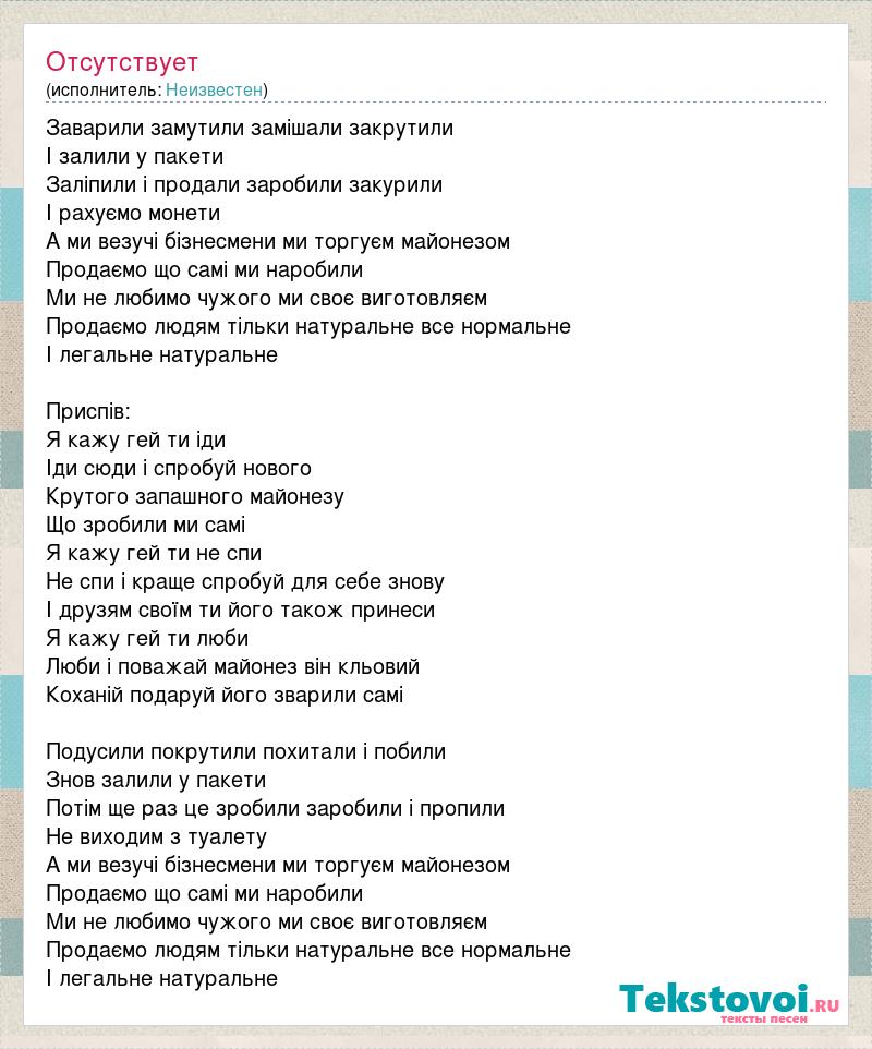 Заварили замутили замішали закрутили І залили у пакети Заліпили і продали заробили закурили І рахуємо монети А ми везучі бізнесмени ми торгуєм майонезом Продаємо що самі ми наробили Ми не любимо чужого ми своє виготовляєм Продаємо людям тільки натуральне все нормальне І легальне натуральне Приспів: Я кажу гей ти іди Іди сюди і спробуй нового Крутого запашного майонезу Що зробили ми самі Я кажу гей ти не спи Не спи і краще спробуй для себе знову І друзям своїм ти його також принеси Я кажу гей ти люби Люби і поважай майонез він кльовий Коханій подаруй його зварили самі Подусили покрутили похитали і побили Знов залили у пакети Потім ще раз це зробили заробили і пропили Не виходим з туалету А ми везучі бізнесмени ми торгуєм майонезом Продаємо що самі ми наробили Ми не любимо чужого ми своє виготовляєм Продаємо людям тільки натуральне все нормальне І легальне натуральне