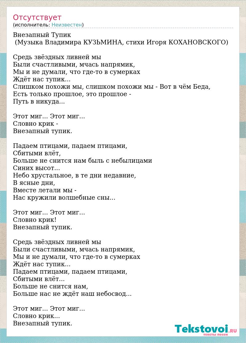 Внезапный Тупик (Музыка Владимира КУЗЬМИНА, стихи Игоря КОХАНОВСКОГО) Средь звёздных ливней мы Были счастливыми, мчась напрямик, Мы и не думали, что где-то в сумерках Ждёт нас тупик... Слишком похожи мы, слишком похожи мы - Вот в чём Беда, Есть только прошлое, это прошлое - Путь в никуда... Этот миг... Этот миг... Словно крик - Внезапный тупик. Падаем птицами, падаем птицами, Сбитыми влёт, Больше не снится нам быль с небылицами Синих высот... Небо хрустальное, в те дни недавние, В ясные дни, Вместе летали мы - Нас кружили волшебные сны... Этот миг... Этот миг... Словно крик! Внезапный тупик. Средь звёздных ливней мы Были счастливыми, мчась напрямик, Мы и не думали, что где-то в сумерках Ждёт нас тупик... Падаем птицами, падаем птицами, Сбитыми влёт... Больше не снится нам, Больше нас не ждёт наш небосвод... Этот миг... Этот миг... Словно крик... Внезапный тупик.