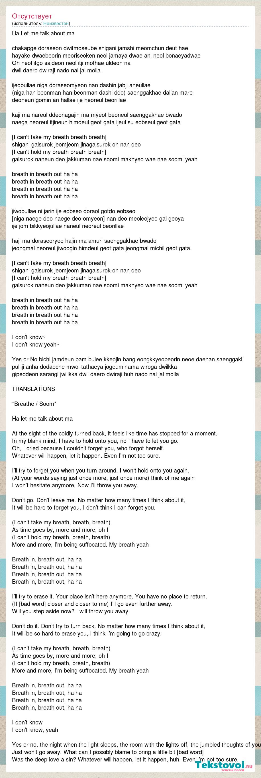Ha Let me talk about ma chakapge doraseon dwitmoseube shigani jamshi meomchun deut hae hayake dwaebeorin meoriseoken neol jamaya dwae ani neol bonaeyadwae Oh neol itgo saldeon neol itji mothae uldeon na dwil daero dwiraji nado nal jal molla ijeobullae niga doraseomyeon nan dashin jabji aneullae (niga han beonman han beonman dashi ddo) saenggakhae dallan mare deoneun gomin an hallae ije neoreul beorillae kaji ma nareul ddeonagajin ma myeot beoneul saenggakhae bwado naega neoreul itjineun himdeul geot gata ijeul su eobseul geot gata [I can't take my breath breath breath] shigani galsurok jeomjeom jinagalsurok oh nan deo [I can't hold my breath breath breath] galsurok naneun deo jakkuman nae soomi makhyeo wae nae soomi yeah breath in breath out ha ha breath in breath out ha ha breath in breath out ha ha breath in breath out ha ha jiwobullae ni jarin ije eobseo doraol gotdo eobseo [niga naege deo naege deo omyeon] nan deo meoleojyeo gal geoya ije jom bikkyeojullae naneul neoreul beorillae haji ma doraseoryeo hajin ma amuri saenggakhae bwado jeongmal neoreul jiwoogin himdeul geot gata jeongmal michil geot gata [I can't take my breath breath breath] shigani galsurok jeomjeom jinagalsurok oh nan deo [I can't hold my breath breath breath] galsurok naneun deo jakkuman nae soomi makhyeo wae nae soomi yeah breath in breath out ha ha breath in breath out ha ha breath in breath out ha ha breath in breath out ha ha I don’t know~ I don’t know yeah~ Yes or No bichi jamdeun bam bulee kkeojin bang eongkkyeobeorin neoe daehan saenggaki pulliji anha dodaeche mwol tathaeya jogeuminama wiroga dwilkka gipeodeon sarangi jwiilkka dwil daero dwiraji huh nado nal jal molla TRANSLATIONS *Breathe / Soom* Ha let me talk about ma At the sight of the coldly turned back, it feels like time has stopped for a moment. In my blank mind, I have to hold onto you, no I have to let you go. Oh, I cried because I couldn’t forget you, who forgot herself. Whatever will happen, let it happen. Even I’m not too sure. I’ll try to forget you when you turn around. I won’t hold onto you again. (At your words saying just once more, just once more) think of me again I won’t hesitate anymore. Now I’ll throw you away. Don’t go. Don’t leave me. No matter how many times I think about it, It will be hard to forget you. I don’t think I can forget you. (I can’t take my breath, breath, breath) As time goes by, more and more, oh I (I can’t hold my breath, breath, breath) More and more, I’m being suffocated. My breath yeah Breath in, breath out, ha ha Breath in, breath out, ha ha Breath in, breath out, ha ha Breath in, breath out, ha ha I’ll try to erase it. Your place isn’t here anymore. You have no place to return. (If [bad word] closer and closer to me) I’ll go even further away. Will you step aside now? I will throw you away. Don’t do it. Don’t try to turn back. No matter how many times I think about it, It will be so hard to erase you, I think I’m going to go crazy. (I can’t take my breath, breath, breath) As time goes by, more and more, oh I (I can’t hold my breath, breath, breath) More and more, I’m being suffocated. My breath yeah Breath in, breath out, ha ha Breath in, breath out, ha ha Breath in, breath out, ha ha Breath in, breath out, ha ha I don’t know I don’t know, yeah Yes or no, the night when the light sleeps, the room with the lights off, the jumbled thoughts of you Just won’t go away. What can I possibly blame to bring a little bit [bad word] Was the deep love a sin? Whatever will happen, let it happen, huh. Even I’m not too sure.