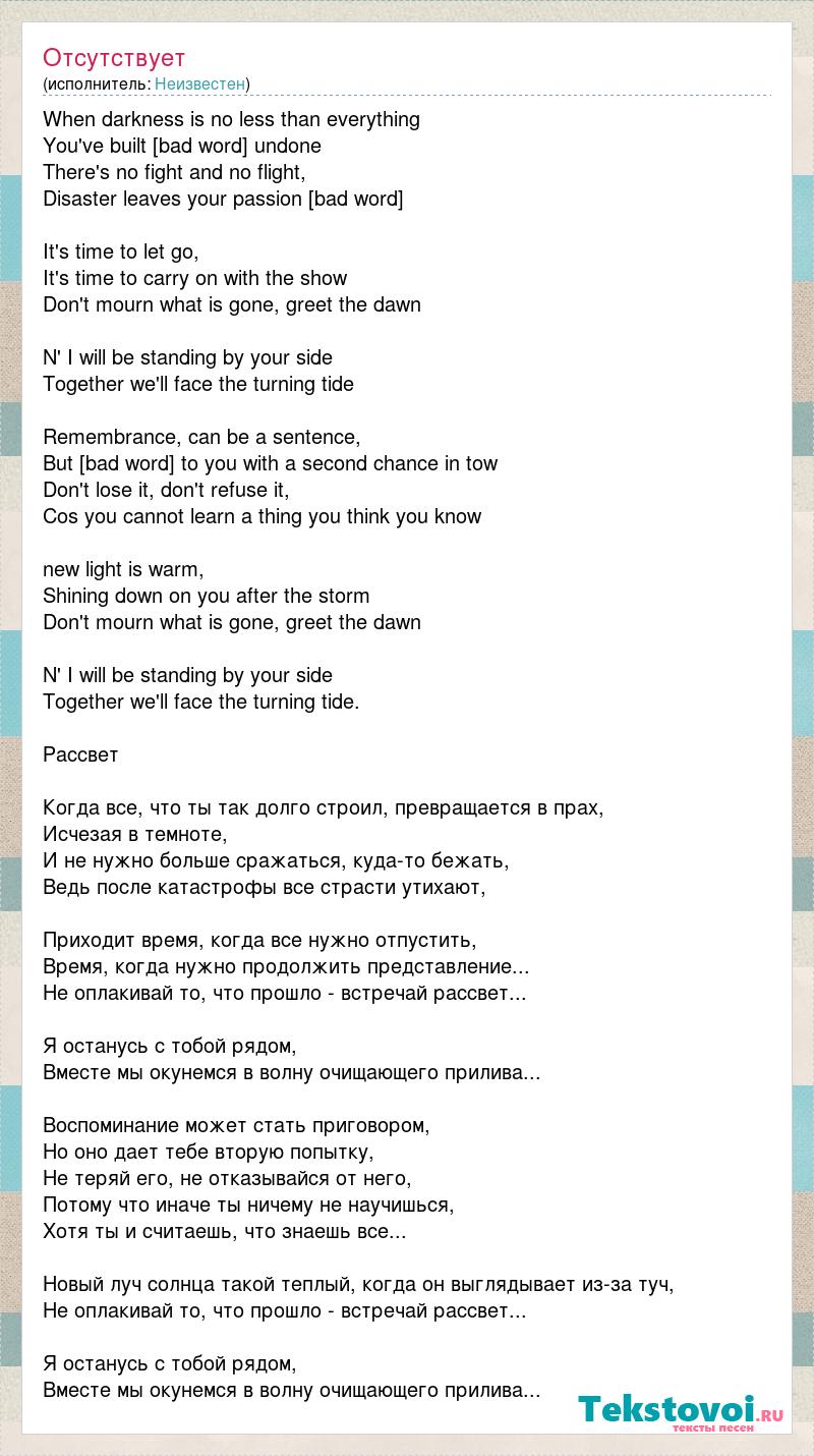 When darkness is no less than everything You've built [bad word] undone There's no fight and no flight, Disaster leaves your passion [bad word] It's time to let go, It's time to carry on with the show Don't mourn what is gone, greet the dawn N' I will be standing by your side Together we'll face the turning tide Remembrance, can be a sentence, But [bad word] to you with a second chance in tow Don't lose it, don't refuse it, Cos you cannot learn a thing you think you know new light is warm, Shining down on you after the storm Don't mourn what is gone, greet the dawn N' I will be standing by your side Together we'll face the turning tide. Рассвет Когда все, что ты так долго строил, превращается в прах, Исчезая в темноте, И не нужно больше сражаться, куда-то бежать, Ведь после катастрофы все страсти утихают, Приходит время, когда все нужно отпустить, Время, когда нужно продолжить представление... Не оплакивай то, что прошло - встречай рассвет... Я останусь с тобой рядом, Вместе мы окунемся в волну очищающего прилива... Воспоминание может стать приговором, Но оно дает тебе вторую попытку, Не теряй его, не отказывайся от него, Потому что иначе ты ничему не научишься, Хотя ты и считаешь, что знаешь все... Новый луч солнца такой теплый, когда он выглядывает из-за туч, Не оплакивай то, что прошло - встречай рассвет... Я останусь с тобой рядом, Вместе мы окунемся в волну очищающего прилива...