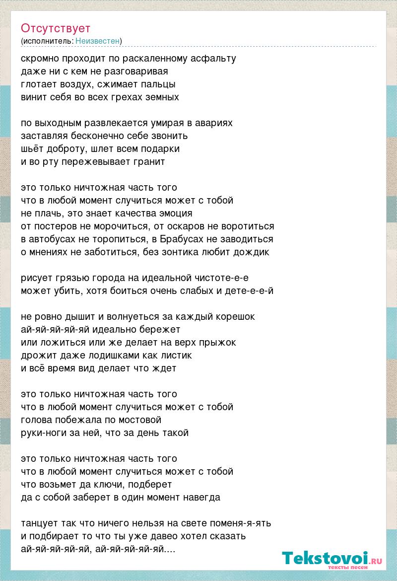 скромно проходит по раскаленному асфальту даже ни с кем не разговаривая глотает воздух, сжимает пальцы винит себя во всех грехах земных по выходным развлекается умирая в авариях заставляя бесконечно себе звонить шьёт доброту, шлет всем подарки и во рту пережевывает гранит это только ничтожная часть того что в любой момент случиться может с тобой не плачь, это знает качества эмоция от постеров не морочиться, от оскаров не воротиться в автобусах не торопиться, в Брабусах не заводиться о мнениях не заботиться, без зонтика любит дождик рисует грязью города на идеальной чистоте-е-е может убить, хотя боиться очень слабых и дете-е-е-й не ровно дышит и волнуеться за каждый корешок ай-яй-яй-яй-яй идеально бережет или ложиться или же делает на верх прыжок дрожит даже лодишками как листик и всё время вид делает что ждет это только ничтожная часть того что в любой момент случиться может с тобой голова побежала по мостовой руки-ноги за ней, что за день такой это только ничтожная часть того что в любой момент случиться может с тобой что возьмет да ключи, подберет да с собой заберет в один момент навегда танцует так что ничего нельзя на свете поменя-я-ять и подбирает то что ты уже давео хотел сказать ай-яй-яй-яй-яй, ай-яй-яй-яй-яй....