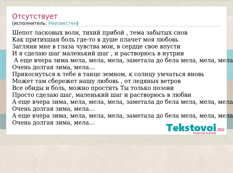 Шепот ласковых волн, тихий прибой , тема забытых снов Как притихшая боль где-то в душе плачет моя любовь Загляни мне в глаза чувства мои, в сердце свое впусти И я сделаю шаг маленький шаг , и растворюсь в нутрии А еще вчера зима мела, мела, мела, заметала до бела мела, мела, мела Очень долгая зима, мела… Прикоснуться к тебе в танце земном, к солнцу умчаться вновь Может там сбережет нашу любовь , от ледяных ветров Все обиды и боль, можно простить Ты только позови Просто сделаю шаг, маленький шаг и растворюсь в любви А еще вчера зима, мела, мела, мела, заметала до бела мела, мела, мела Очень долгая зима, мела… А еще вчера зима, мела, мела, мела, заметала до бела мела, мела, мела Очень долгая зима, мела…