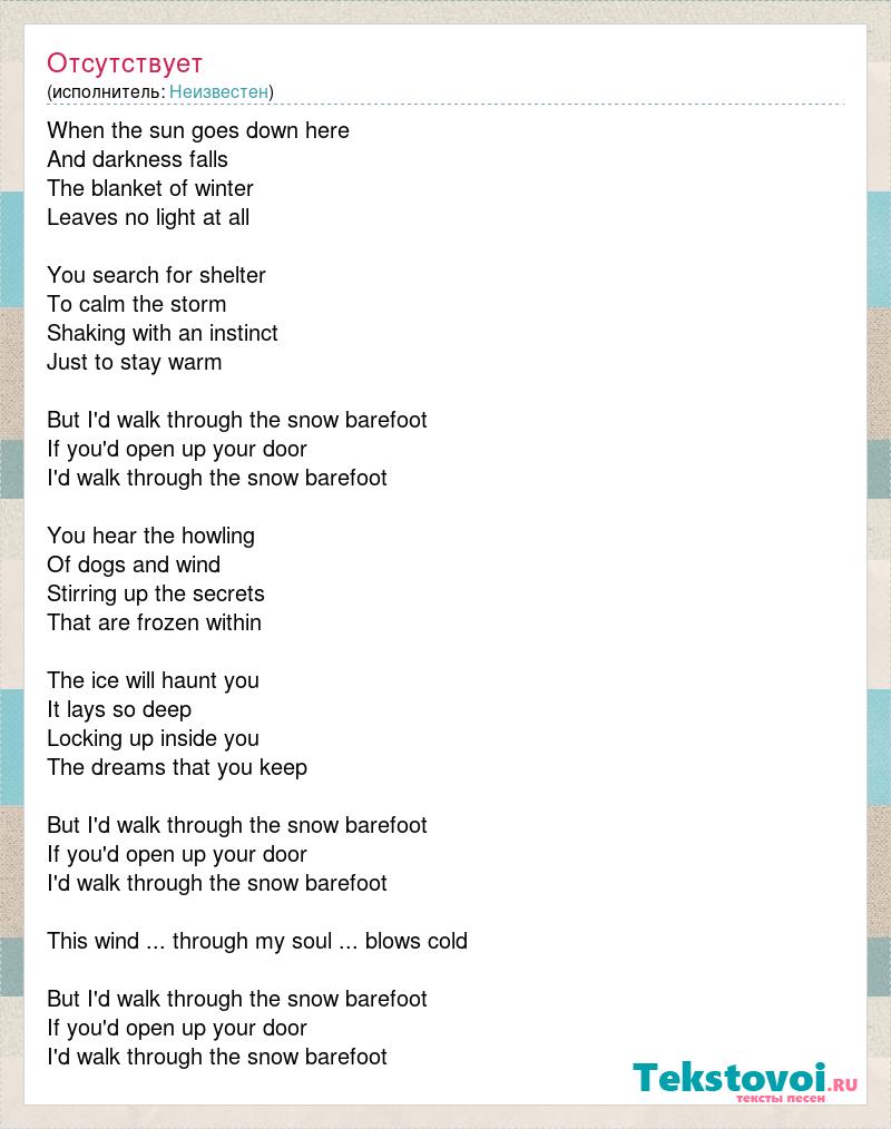 When the sun goes down here And darkness falls The blanket of winter Leaves no light at all You search for shelter To calm the storm Shaking with an instinct Just to stay warm But I'd walk through the snow barefoot If you'd open up your door I'd walk through the snow barefoot You hear the howling Of dogs and wind Stirring up the secrets That are frozen within The ice will haunt you It lays so deep Locking up inside you The dreams that you keep But I'd walk through the snow barefoot If you'd open up your door I'd walk through the snow barefoot This wind ... through my soul ... blows cold But I'd walk through the snow barefoot If you'd open up your door I'd walk through the snow barefoot