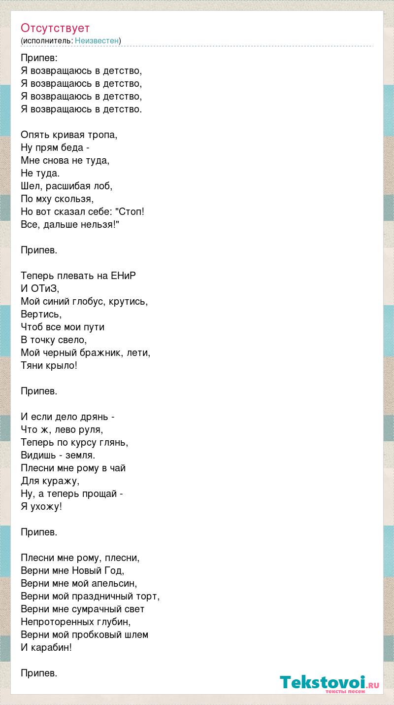 Припев: Я возвращаюсь в детство, Я возвращаюсь в детство, Я возвращаюсь в детство, Я возвращаюсь в детство. Опять кривая тропа, Ну прям беда - Мне снова не туда, Не туда. Шел, расшибая лоб, По мху скользя, Но вот сказал себе: "Стоп! Все, дальше нельзя!" Припев. Теперь плевать на ЕНиР И ОТиЗ, Мой синий глобус, крутись, Вертись, Чтоб все мои пути В точку свело, Мой черный бражник, лети, Тяни крыло! Припев. И если дело дрянь - Что ж, лево руля, Теперь по курсу глянь, Видишь - земля. Плесни мне рому в чай Для куражу, Ну, а теперь прощай - Я ухожу! Припев. Плесни мне рому, плесни, Верни мне Новый Год, Верни мне мой апельсин, Верни мой праздничный торт, Верни мне сумрачный свет Непроторенных глубин, Верни мой пробковый шлем И карабин! Припев.