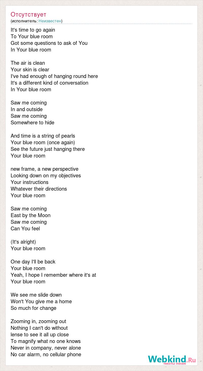 It's time to go again To Your blue room Got some questions to ask of You In Your blue room The air is clean Your skin is clear I've had enough of hanging round here It's a different kind of conversation In Your blue room Saw [bad word] In and outside Saw [bad word] Somewhere to hide And time is a string of pearls Your blue room (once again) See the future just hanging there Your blue room new frame, a new perspective Looking down on my objectives Your [bad word] Whatever their directions Your blue room Saw [bad word] East by the Moon Saw [bad word] Can You feel (It's alright) Your blue room One day I'll be back Your blue room Yeah, I hope I remember where it's at Your blue room We see me slide down Won't You give me a home So much for change Zooming in, zooming out Nothing I can't do without lense to see it all up close To magnify what no one knows Never [bad word] never alone No car alarm, no cellular phone