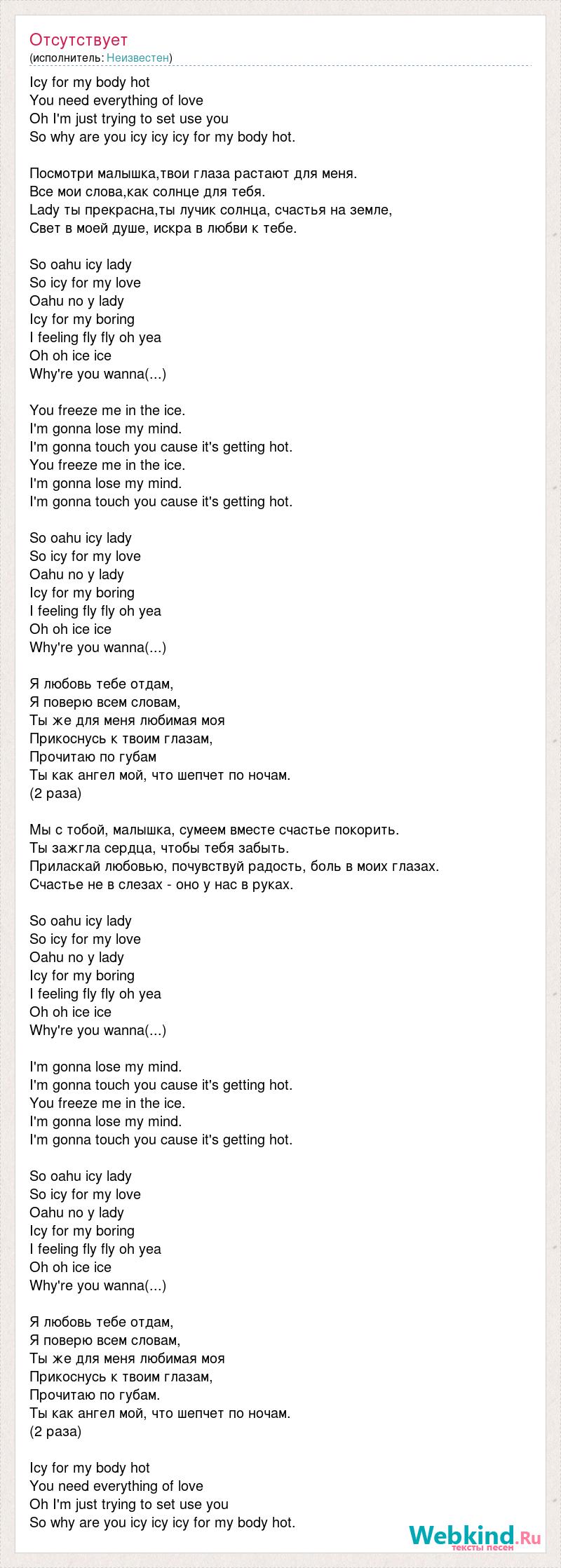 Icy for my body hot You need everything of love Oh I'm just trying to set use you So why are you icy icy icy for my body hot. Посмотри малышка,твои глаза растают для меня. Все мои слова,как солнце для тебя. Lady ты прекрасна,ты лучик солнца, счастья на земле, Свет в моей душе, искра в любви к тебе. So оahu icy lady So icy for my love Oahu no y lady Icy for my boring I feeling fly fly oh yea Oh oh ice ice Why're you wanna(...) You freeze me in the ice. I'm gonna lose my mind. I'm gonna touch you cause it's getting hot. You freeze me in the ice. I'm gonna lose my mind. I'm gonna touch you cause it's getting hot. So оahu icy lady So icy for my love Oahu no y lady Icy for my boring I feeling fly fly oh yea Oh oh ice ice Why're you wanna(...) Я любовь тебе отдам, Я поверю всем словам, Ты же для меня любимая моя Прикоснусь к твоим глазам, Прочитаю по губам Ты как ангел мой, что шепчет по ночам. (2 раза) Мы с тобой, малышка, сумеем вместе счастье покорить. Ты зажгла сердца, чтобы тебя забыть. Приласкай любовью, почувствуй радость, боль в моих глазах. Счастье не в слезах - оно у нас в руках. So оahu icy lady So icy for my love Oahu no y lady Icy for my boring I feeling fly fly oh yea Oh oh ice ice Why're you wanna(...) I'm gonna lose my mind. I'm gonna touch you cause it's getting hot. You freeze me in the ice. I'm gonna lose my mind. I'm gonna touch you cause it's getting hot. So оahu icy lady So icy for my love Oahu no y lady Icy for my boring I feeling fly fly oh yea Oh oh ice ice Why're you wanna(...) Я любовь тебе отдам, Я поверю всем словам, Ты же для меня любимая моя Прикоснусь к твоим глазам, Прочитаю по губам. Ты как ангел мой, что шепчет по ночам. (2 раза) Icy for my body hot You need everything of love Oh I'm just trying to set use you So why are you icy icy icy for my body hot.