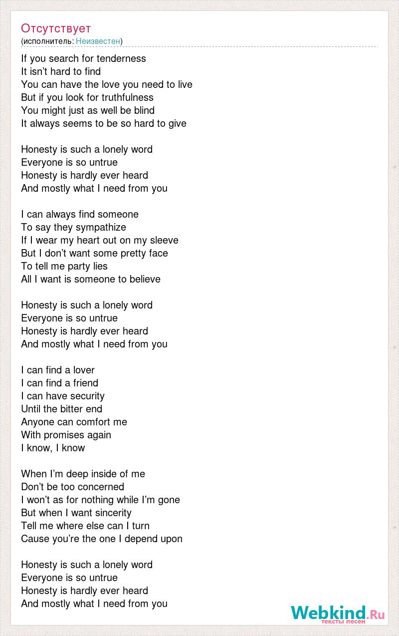 If you search for tenderness It isn’t hard to find You can have the love you need to live But if you look for [bad word] You might just as well be blind It always seems to be so hard to give Honesty is such a lonely word Everyone is so [bad word] Honesty is hardly ever heard And mostly what I need from you I can always find someone To say they sympathize If I wear my heart out on my sleeve But I don’t want some pretty face To tell me party lies All I want is someone to believe Honesty is such a lonely word Everyone is so [bad word] Honesty is hardly ever heard And mostly what I need from you I can find a lover I can find a friend I can have security Until the bitter end Anyone [bad word] me With promises again I know, I know When I’m deep inside of me Don’t be too concerned I won’t as for nothing while I’m gone But when I want sincerity Tell me where else can I turn Cause you’re the one I depend upon Honesty is such a lonely word Everyone is so [bad word] Honesty is hardly ever heard And mostly what I need from you