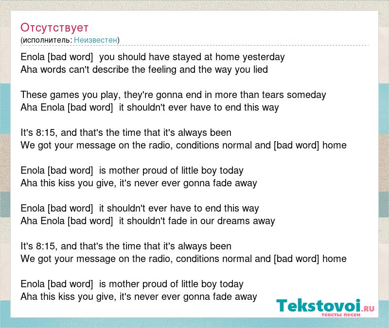 Enola [bad word] you should have stayed at home yesterday Aha words can't describe the feeling and the way you lied These games you play, they're gonna end in more than tears someday Aha Enola [bad word] it shouldn't ever have to end this way It's 8:15, and that's the time that it's always been We got your message on the radio, conditions normal and [bad word] home Enola [bad word] is mother proud of little boy today Aha this kiss you give, it's never ever gonna fade away Enola [bad word] it shouldn't ever have to end this way Aha Enola [bad word] it shouldn't fade in our dreams away It's 8:15, and that's the time that it's always been We got your message on the radio, conditions normal and [bad word] home Enola [bad word] is mother proud of little boy today Aha this kiss you give, it's never ever gonna fade away