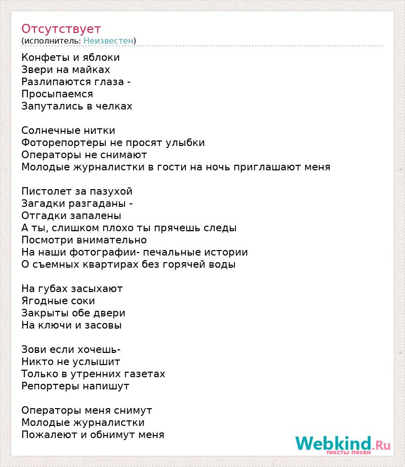 Конфеты и яблоки Звери на майках Разлипаются глаза - Просыпаемся Запутались в челках Солнечные нитки Фоторепортеры не просят улыбки Операторы не снимают Молодые журналистки в гости на ночь приглашают меня Пистолет за пазухой Загадки разгаданы - Отгадки запалены А ты, слишком плохо ты прячешь следы Посмотри внимательно На наши фотографии- печальные истории О съемных квартирах без горячей воды На губах засыхают Ягодные соки Закрыты обе двери На ключи и засовы Зови если хочешь- Никто не услышит Только в утренних газетах Репортеры напишут Операторы меня снимут Молодые журналистки Пожалеют и обнимут меня